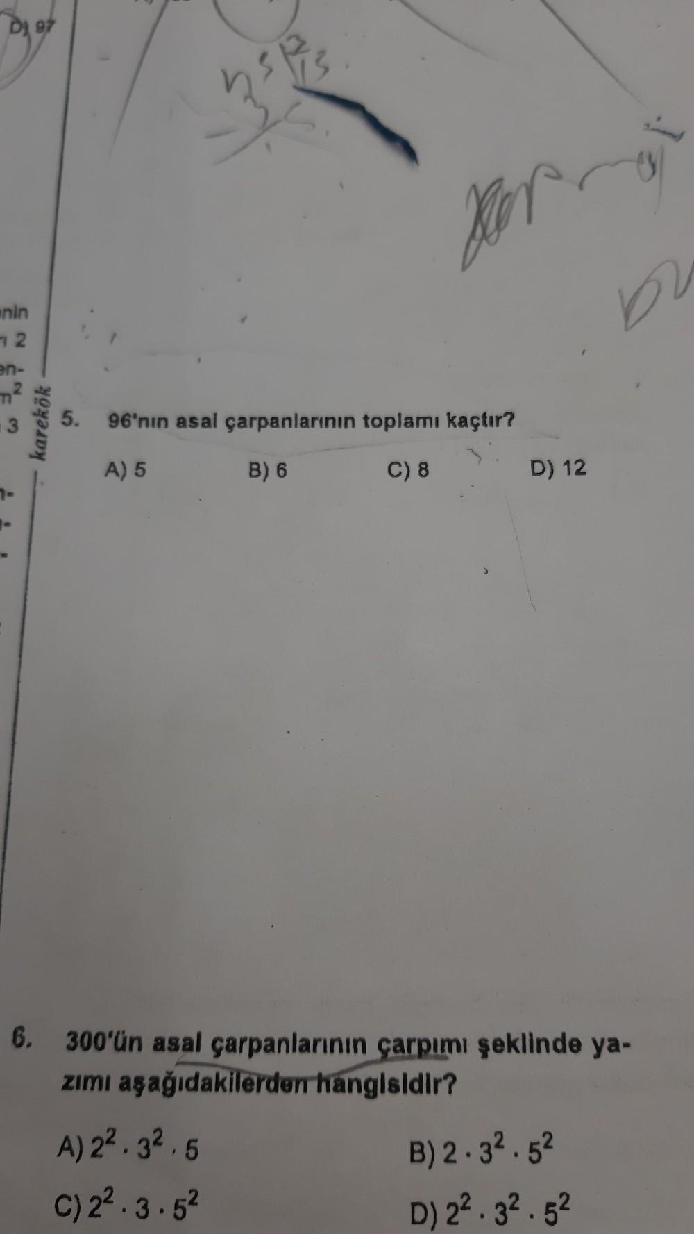 nin 12 en- 3 97 karekök 5. spis Her 96'nın asal çarpanlarının toplamı kaçtır? A) 5 B) 6 C) 8 A) 2².3².5 C) 2².3.5² D) 12 6. 300'