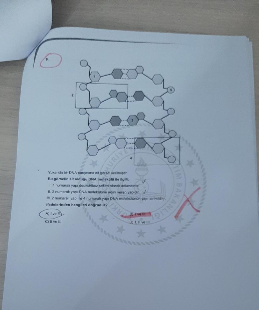 O ****** A) I ve II. C) II ve III. J...K A Yukarıda bir DNA parçasına ait görsel verilmiştir. Bu görselin ait olduğu DNA molekülü ile ilgili; I. 1 numaralı yapı deoksiriboz şekeri olarak adlandırılır. II. 3 numaralı yapı DNA molekülüne adını veren yapıdır. V III. 2 numaralı yapı ile 4 numaralı yapı DNA molekülünün yapı birimidir ifadelerinden hangileri doğrudur? B) I've III. D) I, II ve III. KANLIG **