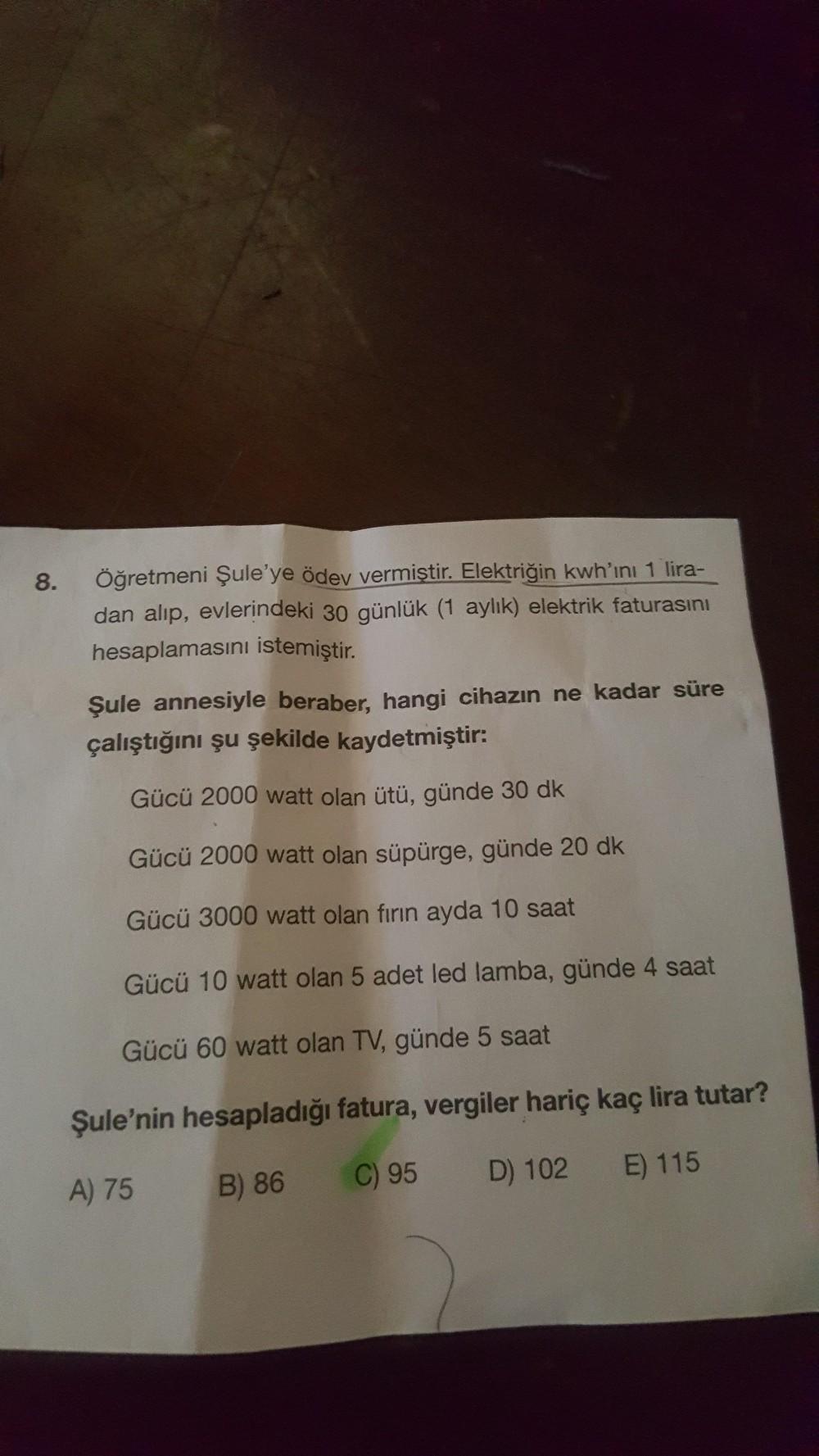 Öğretmeni Şule'ye ödev vermiştir. Elektriğin kwh'ını 1 lira- dan alıp, evlerindeki 30 günlük (1 aylık) elektrik faturasını 8. hesaplamasını istemiştir. Şule annesiyle beraber. hangi cihazın ne kadar süre çalıştığını şu şekilde kaydetmiştir: Gücü 2000 watt olan ütü, günde 30 dk Gücü 2000 watt olan süpürge, günde 20 dk Gücü 3000 watt olan fırın ayda 10 saat Gücü 10 watt olan 5 adet led lamba, günde 4 saat Gücü 60 watt olan TV, günde 5 saat Şule'nin hesapladığı fatura, vergiler hariç kaç lira tutar? A) 75 B) 86 C) 95 D) 102 E) 115
