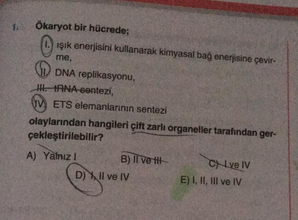 Ökaryot bir hücrede; ışık enerjisini kullanarak kimyasal bağ enerjisine çevir- me, DNA replikasyonu, III. RNA sentezi, VETS elemanlarının sentezi olaylarından hangileri çift zarlı organeller tarafından ger- çekleştirilebilir? A) Yalnızl B) II ve tit D) II ve IV CLve IV E) I, II, III ve IV
