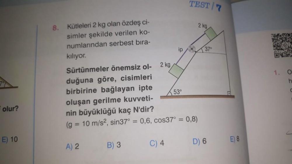olur? E) 10 8. Kütleleri 2 kg olan özdeş ci- simler şekilde verilen ko- numlarından serbest bıra- kılıyor. Sürtünmeler önemsiz ol- duğuna göre, cisimleri birbirine bağlayan ipte oluşan gerilme kuvveti- A) 2 2 kg B) 3 ip C) 4 53° nin büyüklüğü kaç N'dir? (g = 10 m/s², sin37° = 0,6, cos37° = 0,8) TEST/7 2 kg 37° D) 6 E) 8 1. O h C