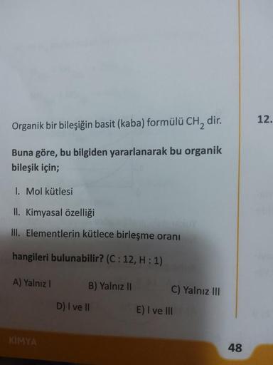 Organik bir bileşiğin basit (kaba) formülü CH₂ dir. Buna göre, bu bilgiden yararlanarak bu organik bileşik için; 1. Mol kütlesi II. Kimyasal özelliği III. Elementlerin kütlece birleşme oranı hangileri bulunabilir? (C: 12, H:1) A) Yalnız I KİMYA B) Yalnız II D) I ve II C) Yalnız III E) I ve III 48 12.