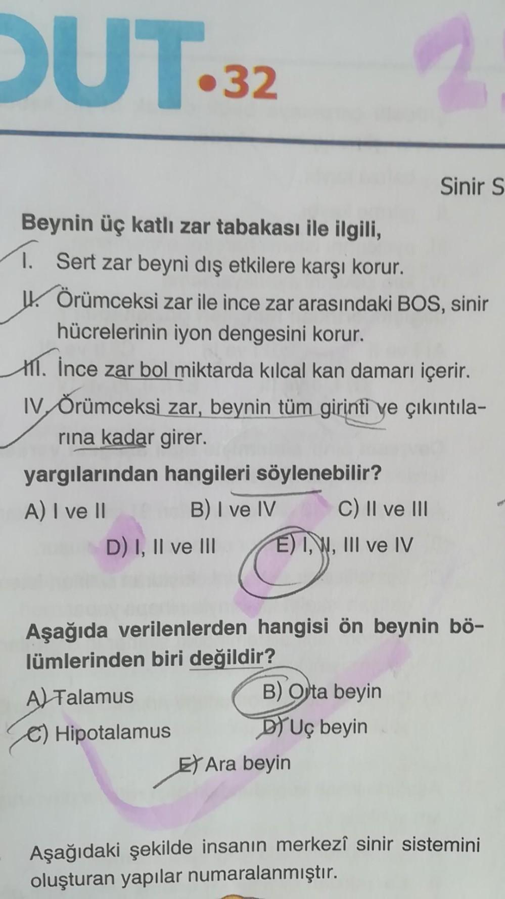 OUT:32 Sinir S. Beynin üç katlı zar tabakası ile ilgili, 1. Sert zar beyni dış etkilere karşı korur. Örümceksi zar ile ince zar arasındaki BOS, sinir hücrelerinin iyon dengesini korur. 111. İnce zar bol miktarda kılcal kan damarı içerir. IV. Örümceksi zar, beynin tüm girinti ye çıkıntıla- rina kadar girer. yargılarından hangileri söylenebilir? A) I ve 11 B) I ve IV C) II ve III D) I, II ve III E) I, III ve IV Aşağıda verilenlerden hangisi ön beynin bö- lümlerinden biri değildir? Al Talamus B) Ota beyin C) Hipotalamus DUç beyin E) Ara beyin Aşağıdaki şekilde insanın merkezi sinir sistemini oluşturan yapılar numaralanmıştır.