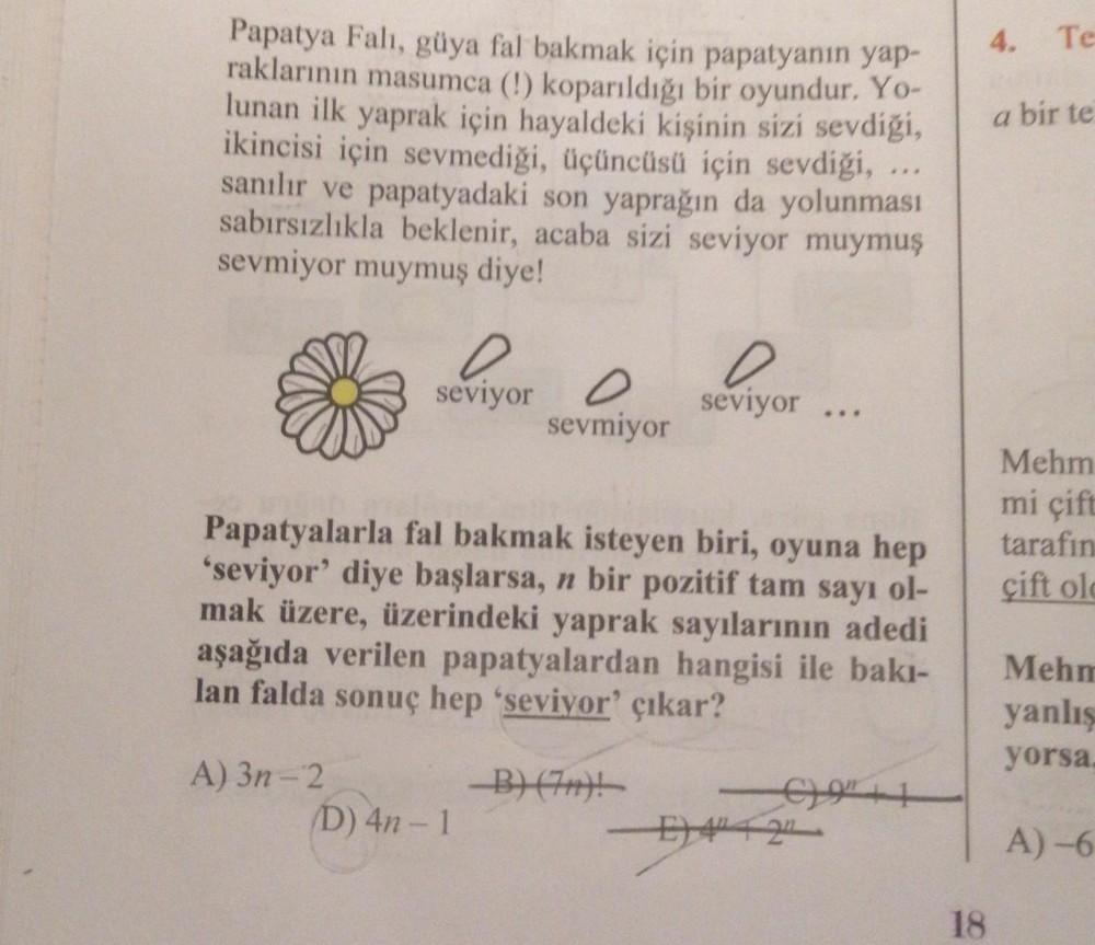 Papatya Falı, güya fal bakmak için papatyanın yap- raklarının masumca (!) koparıldığı bir oyundur. Yo- lunan ilk yaprak için hayaldeki kişinin sizi sevdiği, ikincisi için sevmediği, üçüncüsü için sevdiği, sanılır ve papatyadaki son yaprağın da yolunması sabırsızlıkla beklenir, acaba sizi seviyor muymuş sevmiyor muymuş diye! 0. seviyor A) 3n-2 O sevmiyor Papatyalarla fal bakmak isteyen biri, oyuna hep 'seviyor' diye başlarsa, n bir pozitif tam sayı ol- mak üzere, üzerindeki yaprak sayılarının adedi aşağıda verilen papatyalardan hangisi ile bakı- lan falda sonuç hep 'seviyor' çıkar? -B) (7n)!- (D) 4n-1 D seviyor 18 4. Te a bir te Mehm mi çift tarafın çift ol Mehm yanlış yorsa. A)-6