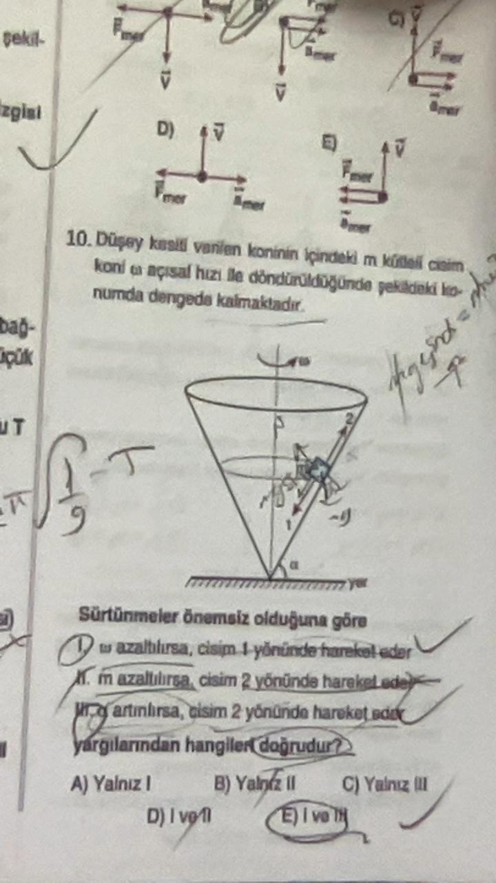 pekit 12 zgini D) 10. Dupay kaski venian koninin içindelim kimi koní a açısal hızı le döndürüldugunde pelldeki ko numda dengede