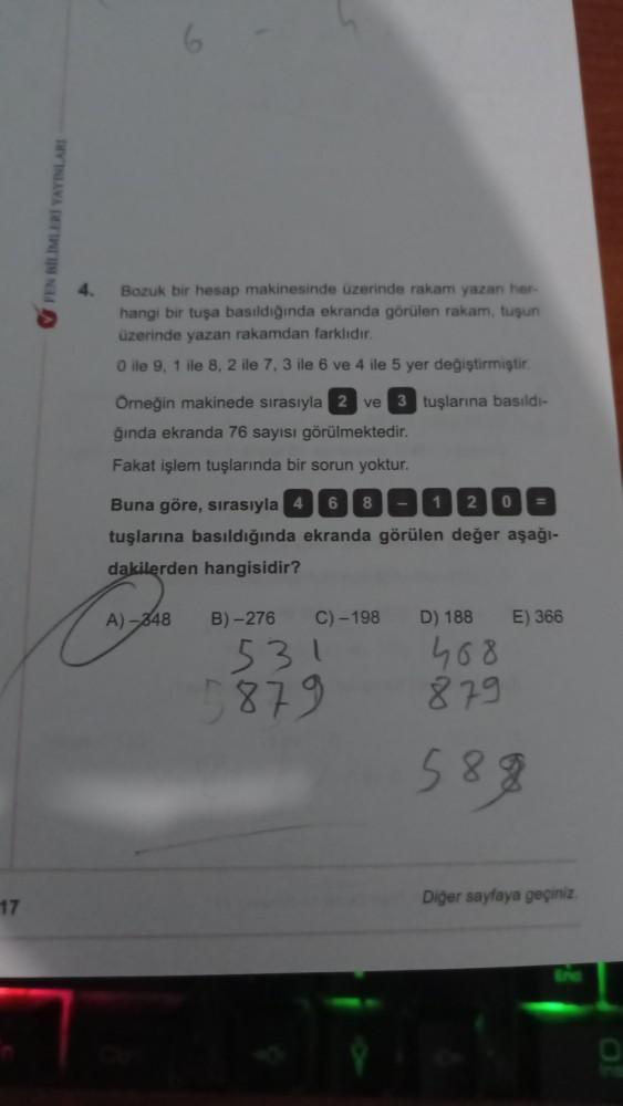 PENSILI YAYINLARI 4. Bozuk bir hesap makinesinde üzerinde rakam yazan her hangi bir tuşa basıldiginda ekranda görülen rakam, tugun üzerinde yazan rakamdan farklidir. O ile 9. 1 ile 8. 2 ile 7, 3 ile 6 ve 4 ile 5 yer değiştirmiştir Omegin makinede sirasıyla 2 ve 3 tuşlarına basıldi- ginda ekranda 76 sayısı görülmektedir. Fakat işlem tuşlarında bir sorun yoktur. Buna göre, sırasıyla 26800200 tuşlarına basıldığında ekranda görülen değer aşağı- dakilerden hangisidir? A) - 348 B)-276 C) -198 D) 188 E) 366 531 5879 408 879 588 Diger sayfaya geçiniz. 17