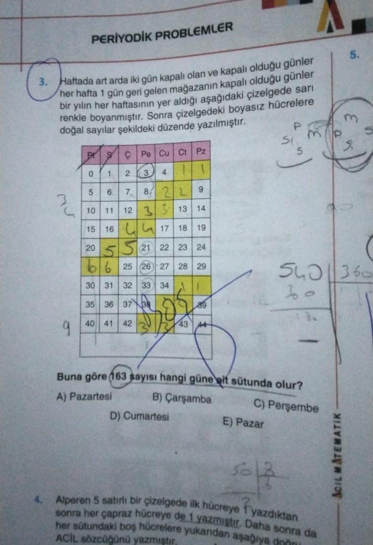 PERİYODİK PROBLEMLER 5. m 3. Haftada art arda iki gün kapalı olan ve kapalı olduğu günler her hafta 1 gün geri gelen mağazanın kapalı olduğu günler bir yılın her haftasının yer aldığı aşağıdaki çizelgede sari renkle boyanmıştır. Sonra çizelgedeki boyasız hücrelere doğal sayılar şekildeki düzende yazılmıştır. P Si POSIÇ Pe Cu Ct Pz 1 2 3 111 8 + ono 6 7 8 9 10 11 18 19 22 12 31313 14 15 16 4 4 17 20 5 5 21 22 23 24 616 25 26 27 28 29 S42 1360 30 31 32 33 34 1 35 36 37 38 189 3 40 41 42 9 43 44 A) Pazartesi Buna göre 663 sayısı hangi güne mit sütunda olur? B) Çarşamba C) Perşembe D) Cumartesi E) Pazar SciL MATEMATIK 5613 sonra her çapraz hücreye de 1 yazmiştir. Daha sonra da Alperen 5 satrli bir çizelgede lik hücreye Fyazdıktan her sütundaki boş hücrelere yukandan aşağıya gnon ACİL Sözcüğünü yazmistir