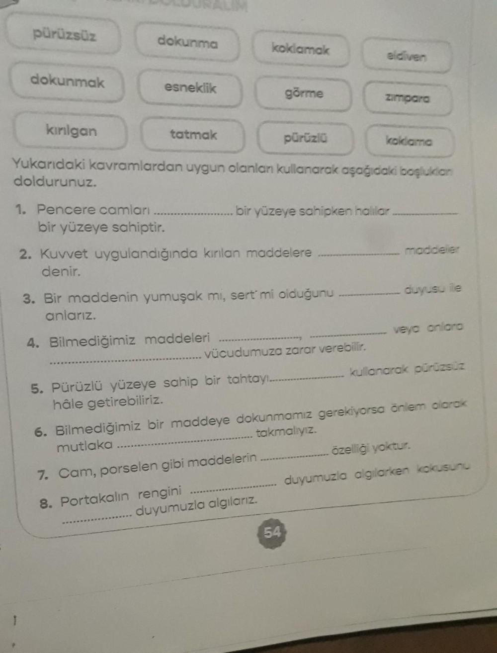 pürüzsüz dokunmak kırılgan dokunma 1. Pencere camları esneklik tatmak bir yüzeye sahiptir. pürüzlü Yukarıdaki kavramlardan uygun olanlan kullanarak aşağıdaki boşluklan doldurunuz. koklamak 4. Bilmediğimiz maddeleri 2. Kuvvet uygulandığında kırılan maddelere denir. 3. Bir maddenin yumuşak mi, sert' mi olduğunu. anlarız. görme bir yüzeye sahipken halilar. .. vücudumuza zarar verebilir. 5. Pürüzlü yüzeye sahip bir tahtay.. hâle getirebiliriz. 7. Cam, porselen gibi maddelerin. 8. Portakalın rengini duyumuzla algılarız. eldiven zımpara 54 koklama . maddeler duyusu ile 6. Bilmediğimiz bir maddeye dokunmamız gerekiyorsa önlem alarak mutlaka takmalıyız. veya onlara kullanarak pürüzsüz .. özelliği yoktur. duyumuzla algılarken kokusunu