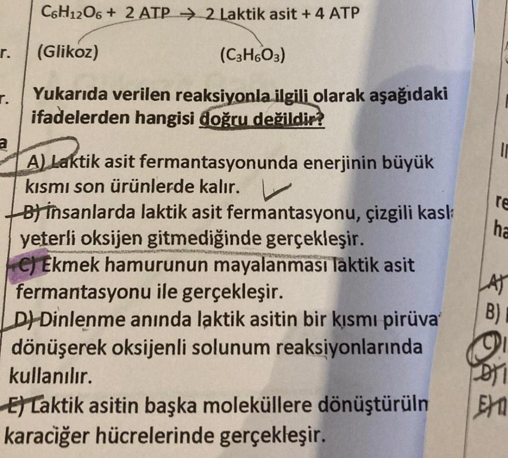 r. T. C6H12O6 + 2 ATP 2 Laktik asit + 4 ATP (Glikoz) Yukarıda verilen reaksiyonla ilgili olarak aşağıdaki ifadelerden hangisi doğru değildir? (C3H6O3) A) Laktik asit fermantasyonunda enerjinin büyük kısmı son ürünlerde kalır. Binsanlarda laktik asit fermantasyonu, çizgili kasla yeterli oksijen gitmediğinde gerçekleşir. WY e) Ekmek hamurunun mayalanması laktik asit fermantasyonu ile gerçekleşir. DH-Dinlenme anında laktik asitin bir kısmı pirüva dönüşerek oksijenli solunum reaksiyonlarında kullanılır. ETaktik asitin başka moleküllere dönüştürüln karaciğer hücrelerinde gerçekleşir. II re ha AT B) Q FOTI EX