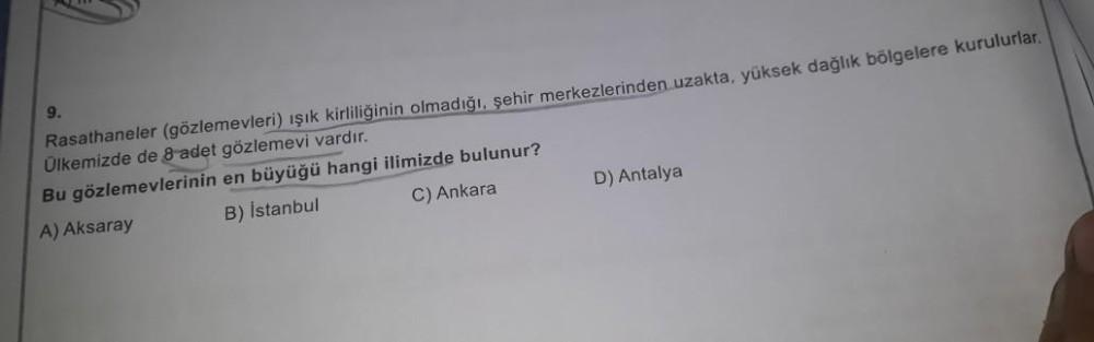 Rasathaneler (gözlemevleri) ışık kirliliğinin olmadığı, şehir merkezlerinden uzakta, yüksek dağlık bölgelere kurulurlar. Ülkemizde de 8 adet gözlemevi vardır. Bu gözlemevlerinin en büyüğü hangi ilimizde bulunur? B) İstanbul A) Aksaray C) Ankara 9. D) Antalya