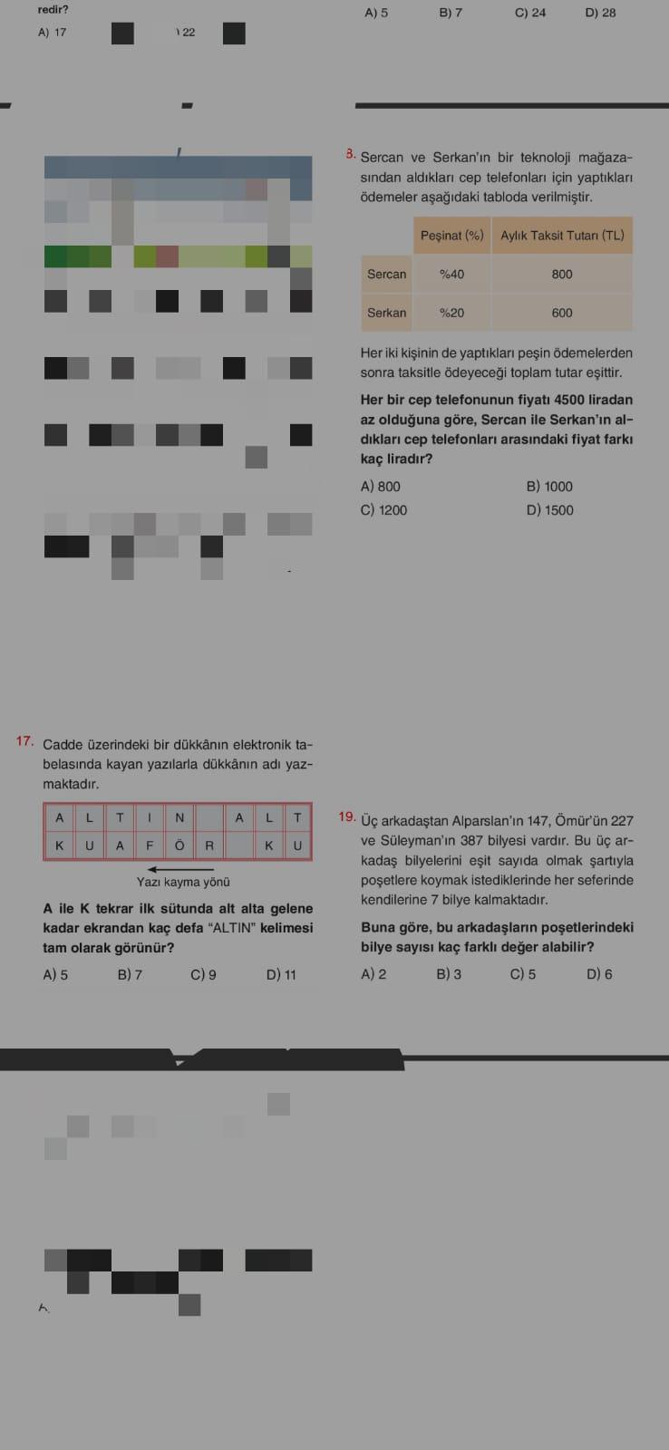 redir? A) 5 B) 7 C) 24 D) 28 A) 17 122 3. Sercan ve Serkan'ın bir teknoloji mağaza- sindan aldıkları cep telefonları için yaptık