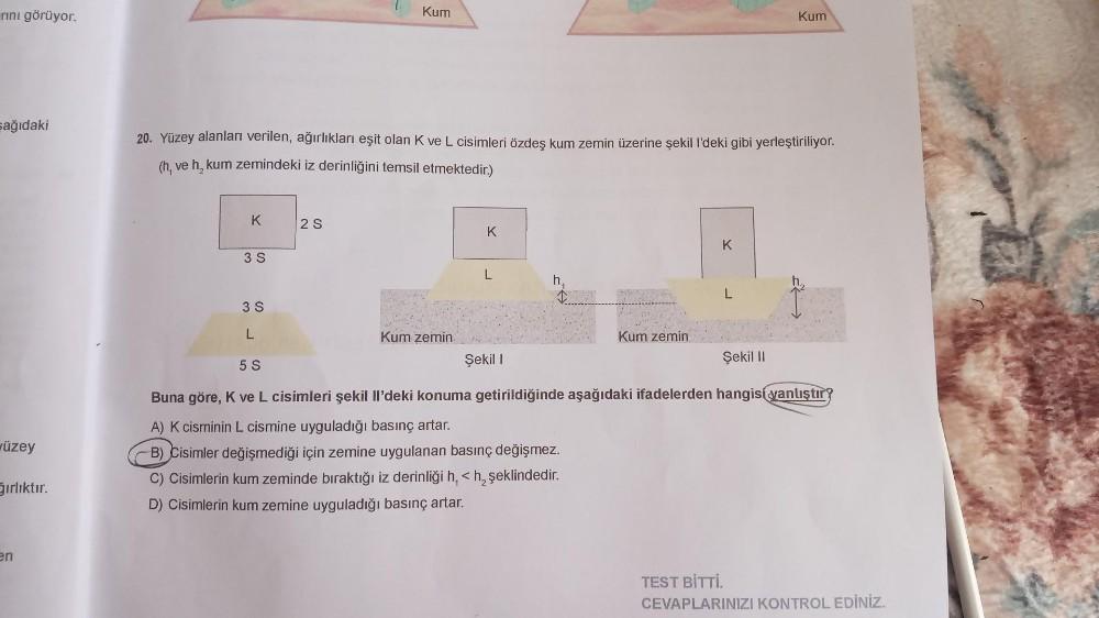 rını görüyor. şağıdaki üzey ğırlıktır. en K 20. Yüzey alanları verilen, ağırlıkları eşit olan K ve L cisimleri özdeş kum zemin üzerine şekil I'deki gibi yerleştiriliyor. (h, ve h, kum zemindeki iz derinliğini temsil etmektedir.) 3 S 3 S L Kum 2 S 5 S Kum zemin. K L Şekil 1 h Kum zemin K Kum L Şekil II Buna göre, K ve L cisimleri şekil Il'deki konuma getirildiğinde aşağıdaki ifadelerden hangisi yanlıştır? A) K cisminin L cismine uyguladığı basınç artar. B) Cisimler değişmediği için zemine uygulanan basınç değişmez. C) Cisimlerin kum zeminde bıraktığı iz derinliği h, <h₂ şeklindedir. D) Cisimlerin kum zemine uyguladığı basınç artar. TEST BİTTİ. CEVAPLARINIZI KONTROL EDİNİZ.