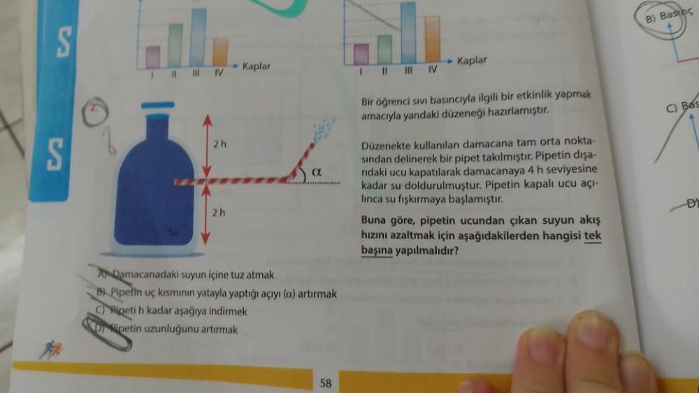 S 111 11 IV Su 2h 2h Kaplar a A Damacanadaki suyun içine tuz atmak B) Pipetin uç kısmının yatayla yaptığı açıyı (a) artırmak C)