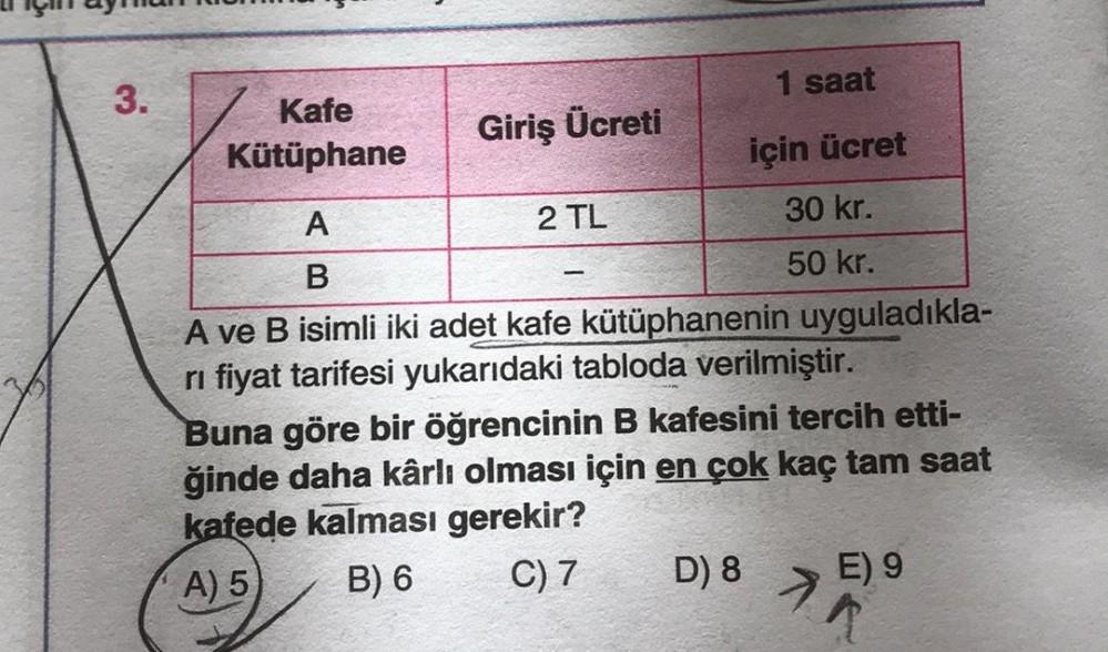 saat 3. Kafe Kütüphane Giriş Ücreti için ücret A 2 TL 30 kr. B 50 kr. A ve B isimli iki adet kafe kütüphanenin uyguladıkla- ri fiyat tarifesi yukarıdaki tabloda verilmiştir. Buna göre bir öğrencinin B kafesini tercih etti- ğinde daha kârlı olması için en çok kaç tam saat kafede kalması gerekir? A) 5 B) 6 C) 7 D) 8 E) 9 an R