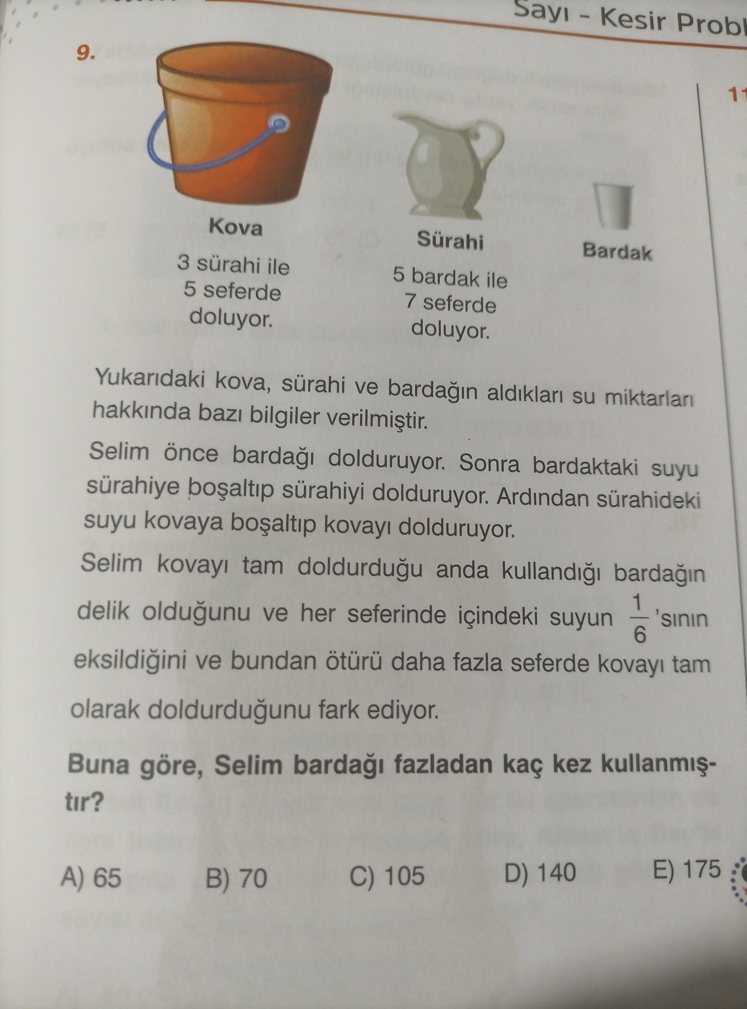 Sayı - Kesir Prob 9. 1 Kova Sürahi Bardak 3 sürahi ile 5 seferde doluyor. 5 bardak ile 7 seferde doluyor. Yukarıdaki kova, sürahi ve bardağın aldıkları su miktarları hakkında bazı bilgiler verilmiştir. Selim önce bardağı dolduruyor. Sonra bardaktaki suyu sürahiye boşaltıp sürahiyi dolduruyor. Ardından sürahideki suyu kovaya boşaltıp kovayı dolduruyor. Selim kovayı tam doldurduğu anda kullandığı bardağın 1 delik olduğunu ve her seferinde içindeki suyun 'sinin 6 eksildiğini ve bundan ötürü daha fazla seferde kovayı tam olarak doldurduğunu fark ediyor. Buna göre, Selim bardağı fazladan kaç kez kullanmış- tır? A) 65 B) 70 C) 105 D) 140 E) 175