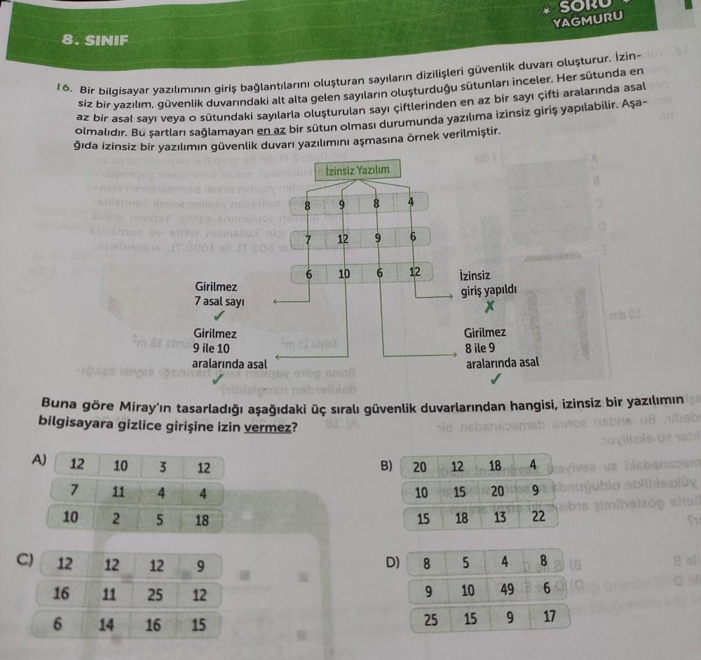 * SC YAĞMURU 8. SINIF 16. Bir bilgisayar yazılımının giriş bağlantılarını oluşturan sayıların dizilişleri güvenlik duvarı oluşturur. İzin-10 siz almair asal sayı veya o sütundaki sayılarla oluşturulan sayı çiftlerinden en az bir sayı çifti aralarında asal olmalıdır. Bu şartları sağlamayan en az bir sütun olması durumunda yazılıma izinsiz giriş yapılabilir . Aşa- ğıda izinsiz bir yazılımın güvenlik duvarı yazılımını aşmasına örnek verilmiştir. izinsiz Yazılım 8 Dari -restored Olssonelias -se los bio 8 sia stosomico PER true on nalinausnir 7 bbs IT0001IT 008 ! 12 9 10 6 12 İzinsiz Girilmez giriş yapıldı 7 asal sayi Smer sim 9 ile 10 aralarında a asal Girilmez Girilmez Smaid 8 ile 9 - aralarında asal Top 8 nebelixisb Buna göre Miray'ın tasarladığı aşağıdaki üç sıralı güvenlik duvarlarından hangisi, izinsiz bir yazılımın bilgisayara gizlice girişine izin vermez? id nosomab sino sons u babe ovile u 12 10 3 12 B) 20 12 18 4 Deyisa wa nisbangan 7 11 4 4 10 15 20 gbbloria 10 cibus simihezeshon 2 5 18 15 18 13 22 A) C) 12 12 12 9 D) 8 8 5 4 8 ta 8 16 25 11 12 9 10 6 49 6 14 17 15 9 25 16 15