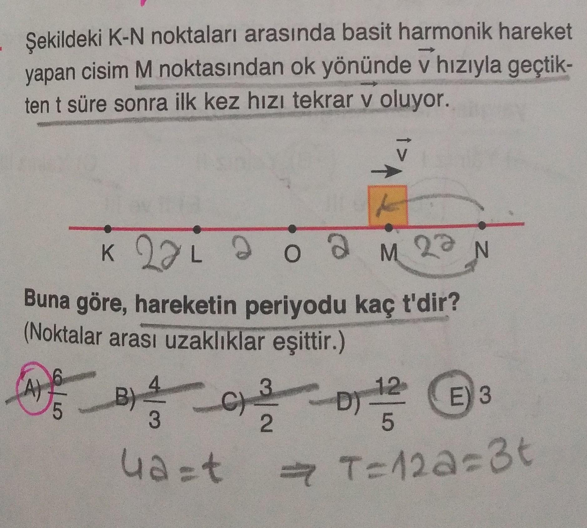 Şekildeki K-N noktaları arasında basit harmonik hareket yapan cisim M noktasından ok yönünde v hızıyla geçtik- ten t süre sonra