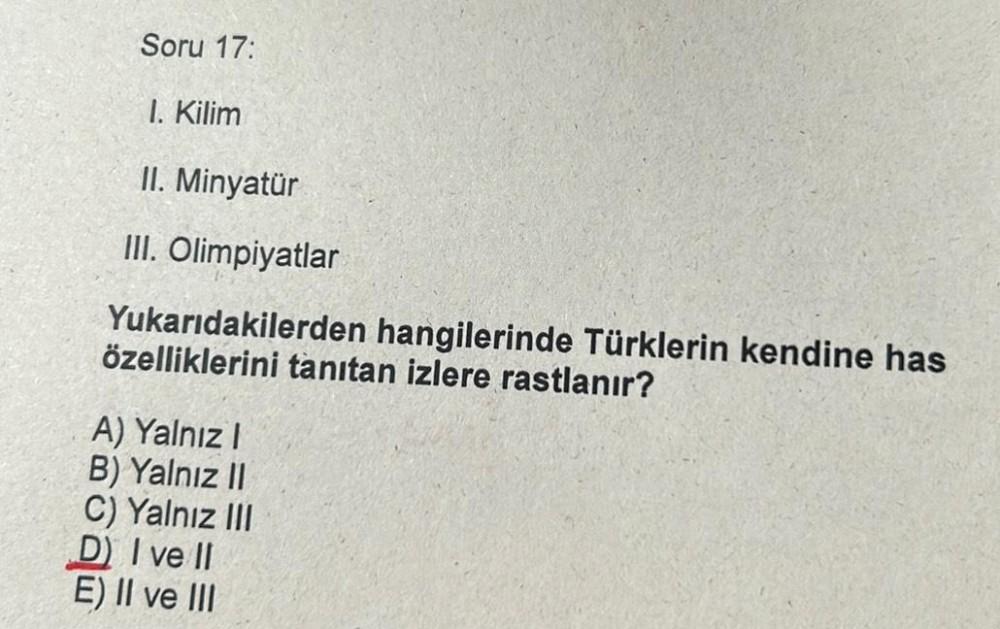 Soru 17: 1. Kilim II. Minyatür III. Olimpiyatlar Yukarıdakilerden hangilerinde Türklerin kendine has özelliklerini tanıtan izlere rastlanır? A) Yalnız I B) Yalnız II C) Yalnız III D) I ve II E) II ve III