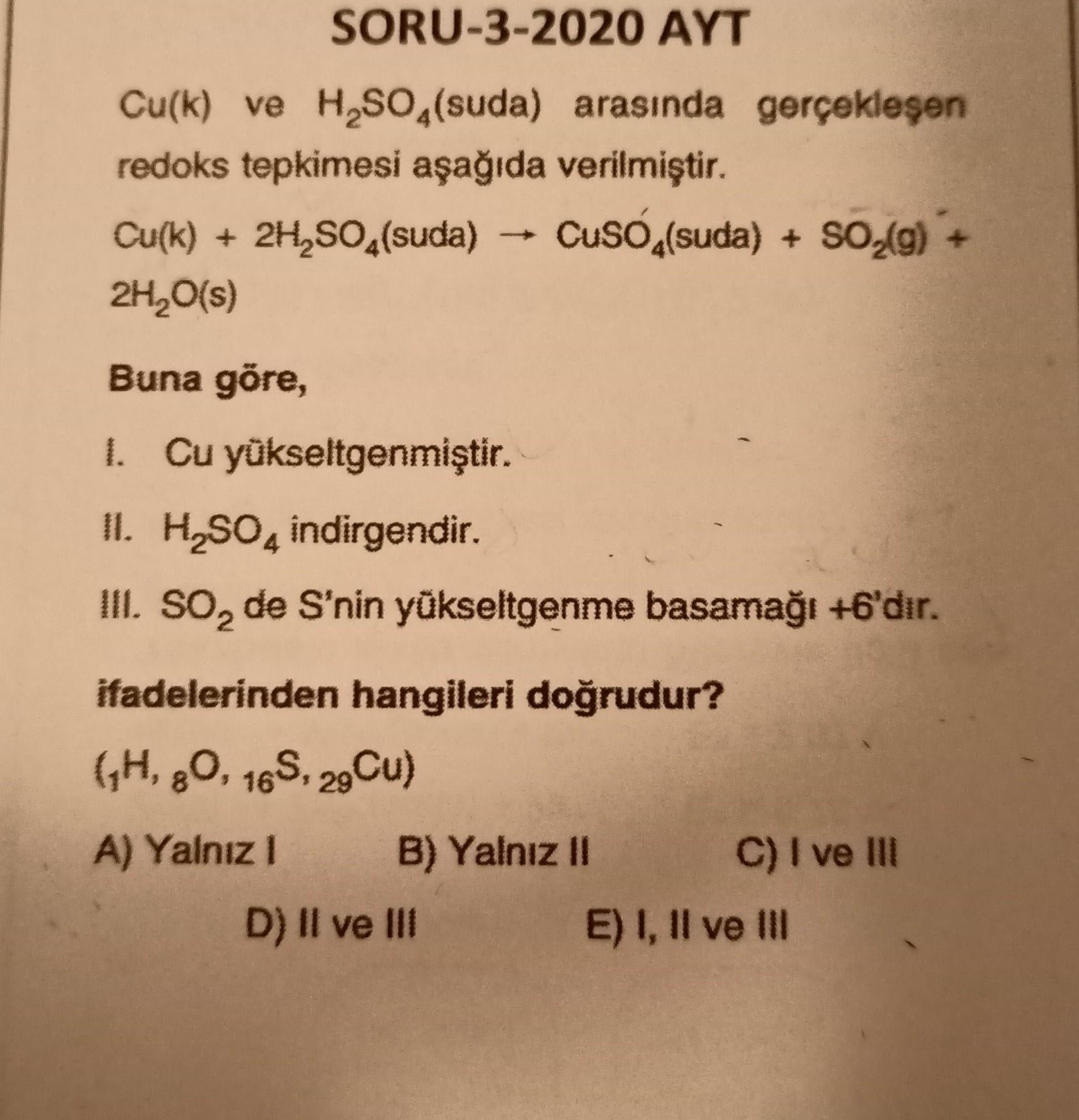 SORU-3-2020 AYT Cu(k) ve H2SO4(suda) arasında gerçekleşen redoks tepkimesi aşağıda verilmiştir. Cu(k) + 2H2SO4(suda) → CuSOą(sud