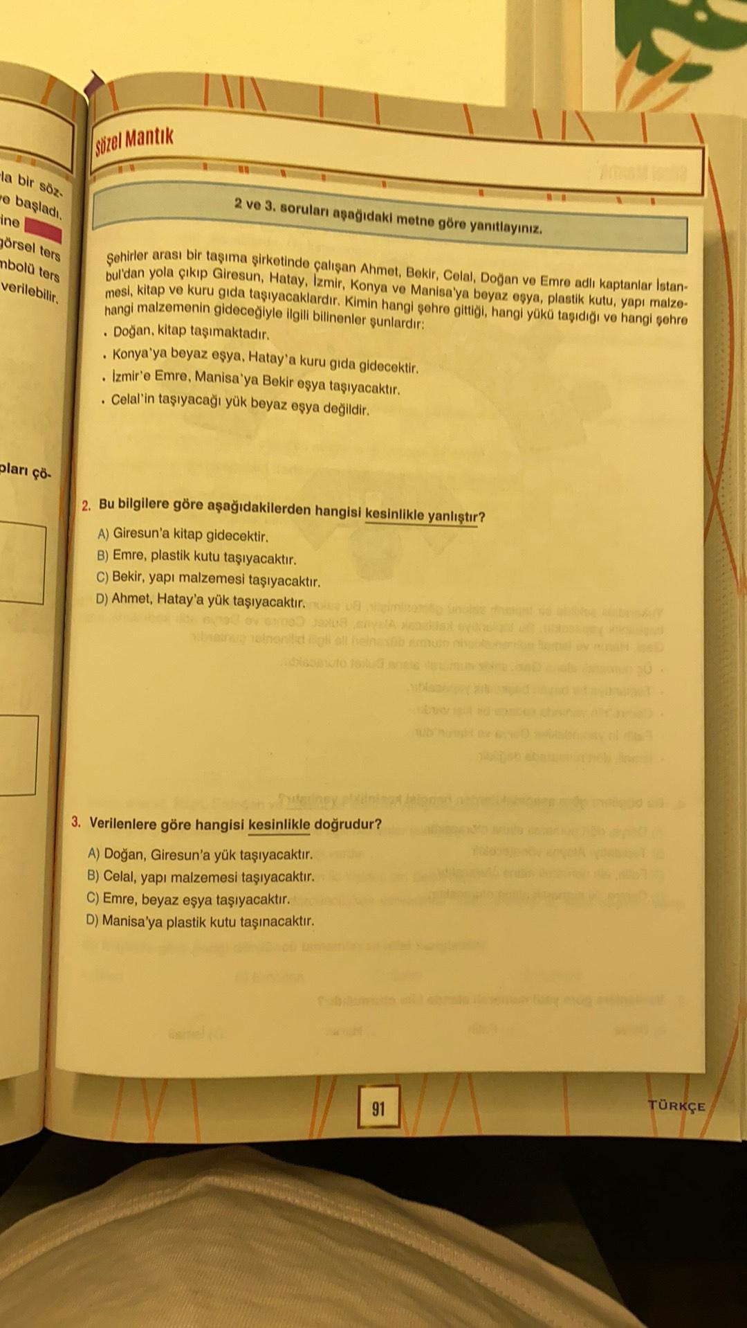 sözel Mantik la bir söz e başladı. 2 ve 3. soruları aşağıdaki metne göre yanıtlayınız. ine hörsel ters mboli ters verilebilir. Şehirler arası bir tasima şirketinde çalışan Ahmet, Bekir, Colal, Doğan ve Emre adlı kaptanlar Istan- bul'dan yola çıkıp Giresun, Hatay, Izmir, Konya ve Manisa'ya boyaz eşya, plastik kutu, yapı malze- mesi , kitap ve kuru gıda taşıyacaklardır. Kimin hangi sohre gittigi, hangi yükü taşıdığı ve hangi gohro hangi malzemenin gideceğiyle ilgili bilinenler şunlardır: Doğan, kitap taşımaktadır. Konya'ya beyaz eşya, Hatay'a kuru gıda gidecektir. . Izmir'e Emre, Manisa'ya Bekir eşya taşıyacaktır. Celal'in taşıyacağı yük beyaz eşya değildir. pları çö- 2. Bu bilgilere göre aşağıdakilerden hangisi kesinlikle yanlıştır? A) Giresun'a kitap gidecektir. B) Emre, plastik kutu taşıyacaktır. C) Bekir, yapı malzemesi taşıyacaktır. D) Ahmet, Hatay'a yük taşıyacaktır. 3. Verilenlere göre hangisi kesinlikle doğrudur? A) Doğan, Giresun'a yük taşıyacaktır. B) Celal, yapı malzemesi taşıyacaktır. C) Emre, beyaz eşya taşıyacaktır. D) Manisa'ya plastik kutu taşınacaktır. 91 TÜRKÇE