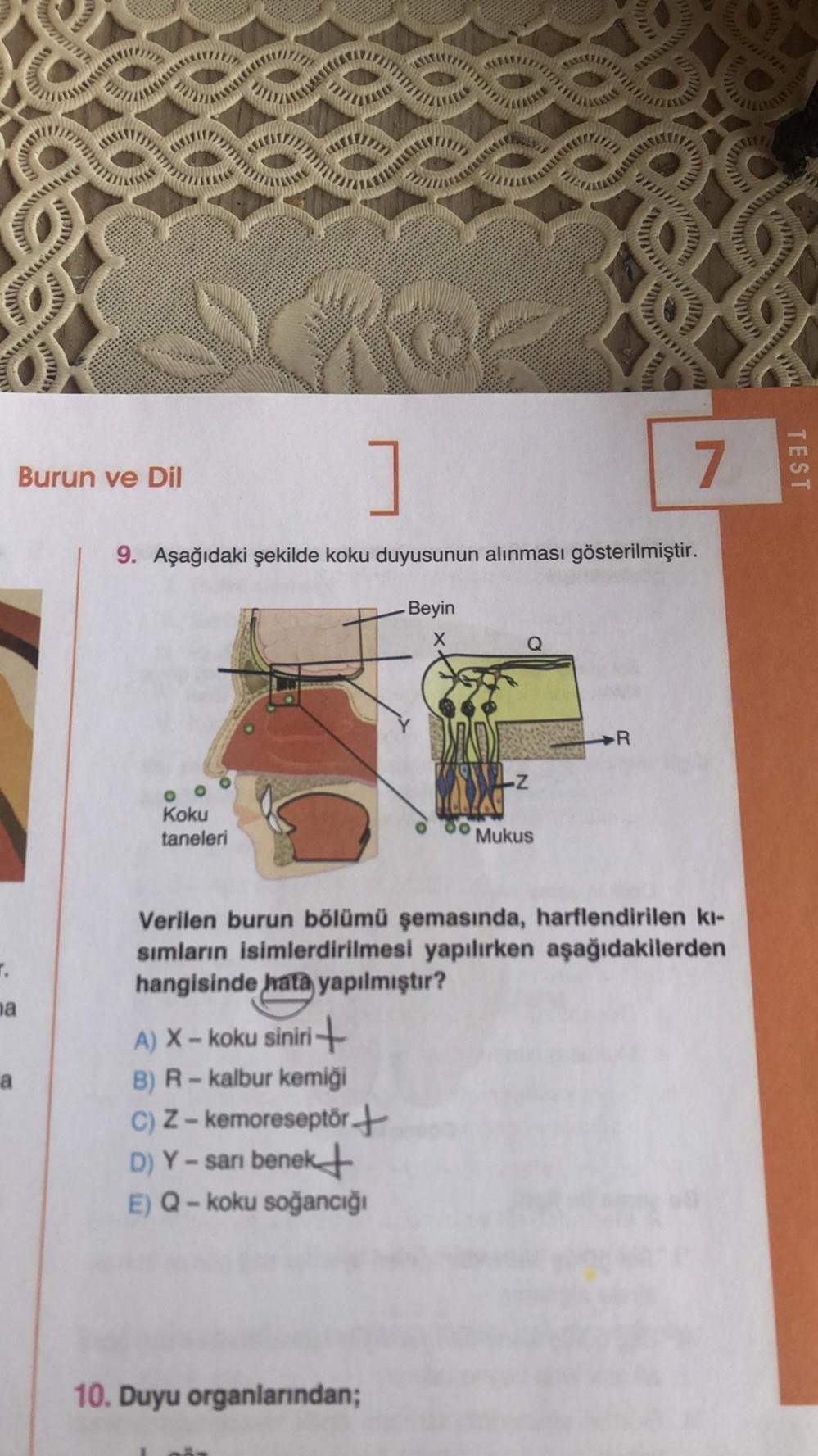 T. Burun ve Dil a a ] Koku taneleri 9. Aşağıdaki şekilde koku duyusunun alınması gösterilmiştir. A) X-koku siniri+ B) R - kalbur kemiği C) Z-kemoreseptör + D) Y-san benek + E) Q-koku soğancığı Beyin X 10. Duyu organlarından; Z www Mukus 7 R Verilen burun bölümü şemasında, harflendirilen kı- sımların isimlerdirilmesi yapılırken aşağıdakilerden hangisinde hata yapılmıştır? ATATATA Apunts AZAZA TEST