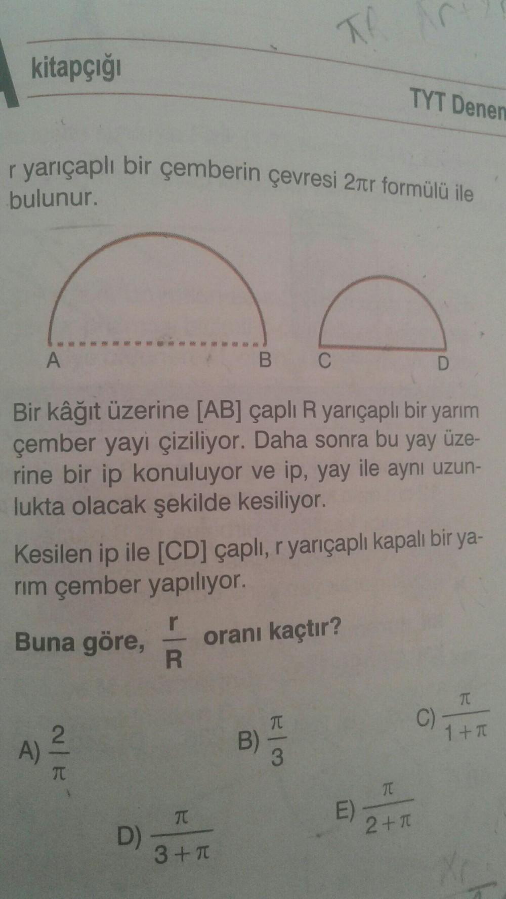 TA r yarıçaplı bir çemberin çevresi 2ter formülü ile kitapçığı bulunur. TYT Dener A B C D Bir kâğıt üzerine [AB] çaplı R yarıçaplı bir yarım çember yayi çiziliyor. Daha sonra bu yay üze- rine bir ip k