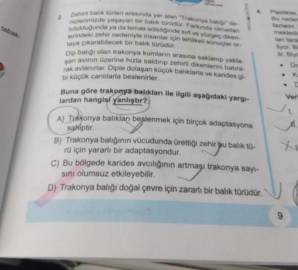 tabak- 2. dönences IWBOVYAN Zehirli balık türleri arasında yer alan "Trakonya balığı" de- nizlerimizde yaşayan bir balık türüdür. Farkında olmadan tutulduğunda ya da temas edildiğinde sırt ve yüzgeç diken- lerindeki zehir nedeniyle insanlar için tehlikeli sonuçlar or- taya çıkarabilecek bir balık türüdür. Dip balığı olan trakonya kumların arasına saklanıp yakla- şan avının üzerine hızla saldırıp zehirli dikenlerini batıra- rak avlanırlar. Dipte dolaşan küçük balıklarla ve karides gi- bi küçük canlılarla beslenirler. Buna göre trakonya balıkları ile ilgili aşağıdaki yargı- lardan hangisi yanlıştır? A) Trakonya balıkları beslenmek için birçok adaptasyona sahiptir. B) Trakonya balığının vücudunda ürettiği zehir bu balık tü- rü için yararlı bir adaptasyondur. 4. C) Bu bölgede karides avcılığının artması trakonya sayı- sını olumsuz etkileyebilir. D) Trakonya balığı doğal çevre için zararlı bir balık türüdür. Plastikler, Bu neden fazladır. mektedin ları tarat liyor. Bi lir. Biyo Or . Ka D Veri 9