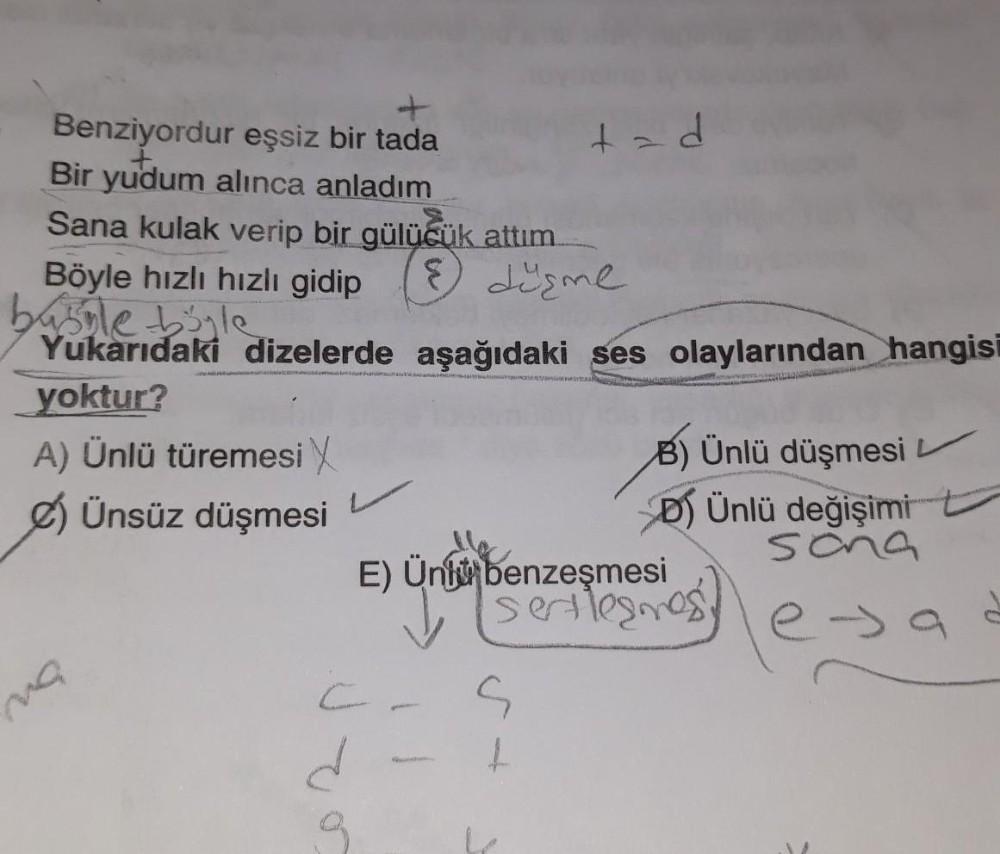 Benziyordur eşsiz bir tada Bir yudum alınca anladım Sana kulak verip bir gülücük attım Böyle hızlı hızlı gidip Yukarıdaki dizelerde aşağıdaki ses olaylarından hangisi yoktur? A) Ünlü türemesi B) Ünlü düşmesi C) Ünsüz düşmesi D) Ünlü değişimi E) Ünlü benzeşmesi