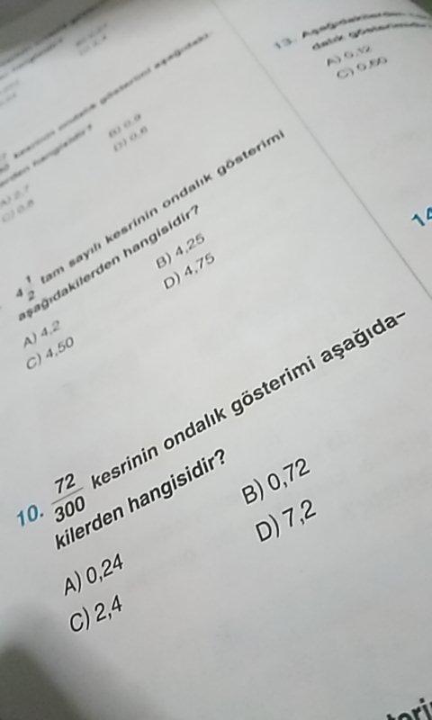 tam sayı kesrinin ondalik gösterimi aşağıdakilerden hangisidir? B) 4,25 D) 4,75 C) 4,50 10. 300 D) 7,2 10.72 kesrinin ondalık gösterimi aşağıda- kilerden hangisidir? A) 0,24 B) 0,72 C) 2,4