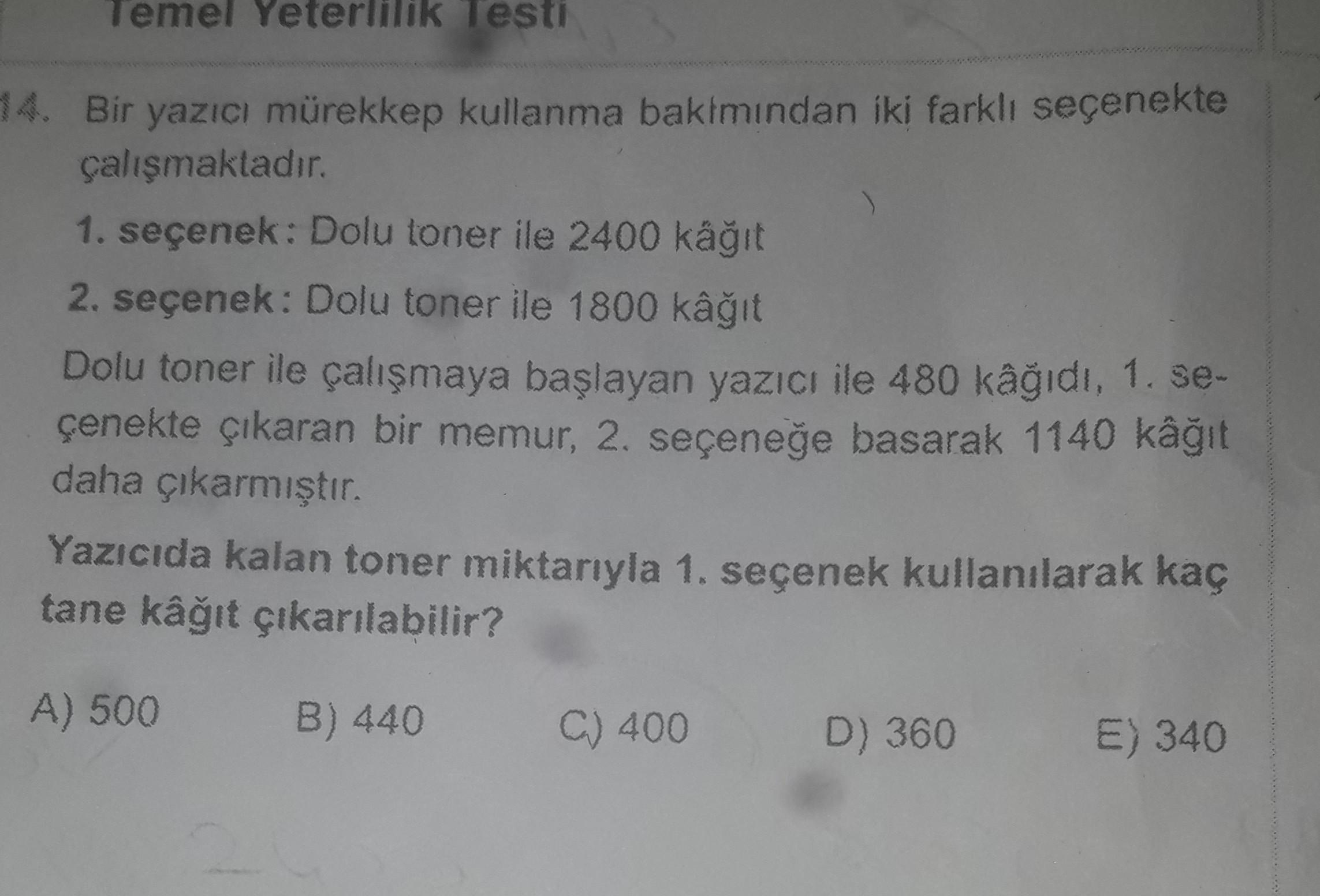 Temel Yeterlilik Testi 14. Bir yazıcı mürekkep kullanma bakımından iki farklı seçenekte çalışmaktadır. 1. seçenek: Dolu toner ile 2400 kağıt 2. seçenek: Dolu toner ile 1800 kâğıt Dolu toner ile çalışmaya başlayan yazıcı ile 480 kâğıdı, 1. se- çenekte çıkaran bir memur, 2. seçeneğe basarak 1140 kâğıt daha çıkarmıştır. Yazıcıda kalan toner miktarıyla 1. seçenek kullanılarak kaç tane kâğıt çıkarılabilir? A) 500 B) 440 C) 400 D) 360 E) 340