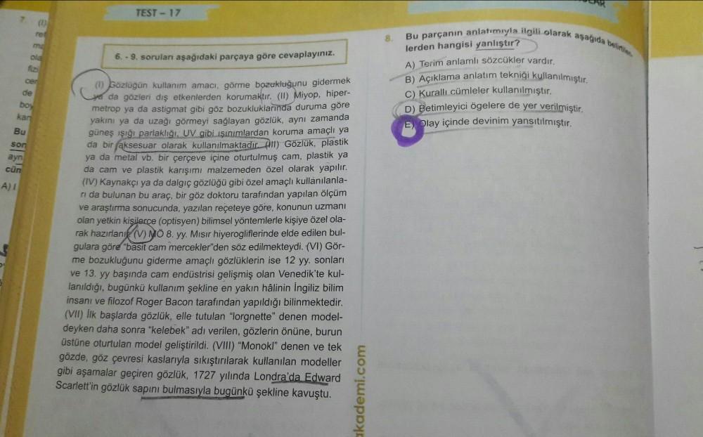 TEST-17 (D) re 8 me ola 6. - 9. soruları aşağıdaki parçaya göre cevaplayınız. lerden hangisi yanlıştır? A) Terim anlamlı sözcükler vardır. cer de boy kan c) Kurallı cümleler kullanılmıştır. D) Betimleyici ögelere de yer verilmiştir. E) Olay içinde devinim yansıtılmıştır. Bu son ayn cün A) 1 (1) bozlüğün kullanım amacı, görme bozukluğunu gidermek da gözleri dış etkenlerden korumaktır. (II) Miyop, hiper- metrop ya da astigmat gibi göz bozukluklarında duruma göre yakını ya da uzağı görmeyi sağlayan gözlük, aynı zamanda güneş ışığı parlaklığı. UV gibi ışınımlardan koruma amaçlı ya da bir aksesuar olarak kullanılmaktadır. An) Gözlük, plastik ya da metal vb. bir çerçeve içine oturtulmuş cam, plastik ya da cam ve plastik karışımı malzemeden özel olarak yapılır. (IV) Kaynakçı ya da dalgıç gözlüğü gibi özel amaçlı kullanılanla- ni da bulunan bu araç, bir göz doktoru tarafından yapılan ölçüm ve araştırma sonucunda, yazılan reçeteye göre, konunun uzmanı olan yetkin kisilerce (optisyen) bilimsel yöntemlerle kişiye özel ola- rak hazırlanık (V) MÖ 8. yy. Mısır hiyerogliflerinde elde edilen bul- gulara göre "basit cam mercekler"den söz edilmekteydi. (VI) Gör- me bozukluğunu giderme amaçlı gözlüklerin ise 12 yy. sonları ve 13. yy başında cam endüstrisi gelişmiş olan Venedik'te kul- lanıldığı, bugünkü kullanım şekline en yakın hâlinin ingiliz bilim insanı ve filozof Roger Bacon tarafından yapıldığı bilinmektedir. (VII) İlk başlarda gözlük, elle tutulan “lorgnette" denen model- deyken daha sonra "kelebek" adı verilen, gözlerin önüne, burun üstüne oturtulan model geliştirildi. (VIII) "Monokl" denen ve tek gözde, göz çevresi kaslarıyla sıkıştırılarak kullanılan modeller gibi aşamalar geçiren gözlük, 1727 yılında Londra'da Edward Scarlett'in gözlük sapını bulmasıyla bugünkü şekline kavuştu. akademi.com Bu parçanın anlatımıyla ilgili olarak aşağıda beline B) Açıklama anlatım tekniği kullanılmıştır.