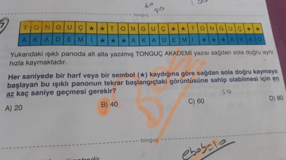tongue - TIONGUÇ**T ONGUÇ** TONGUC ** AKADEM ** AKADEMI ***AKAD Yukarıdaki ışıklı panoda alt alta yazılmış TONGUÇ AKADEMİ yazısı sağdan sola doğru aynı hızla kaymaktadır. Her saniyede bir harf veya bir sembol (*) kaydığına göre sağdan sola doğru kaymaya başlayan bu işıklı panonun tekrar başlangıçtaki görüntüsüne sahip olabilmesi için en az kaç saniye geçmesi gerekir? 50 A) 20 C) 60 D) 80 B) 40 tonguç ebobola