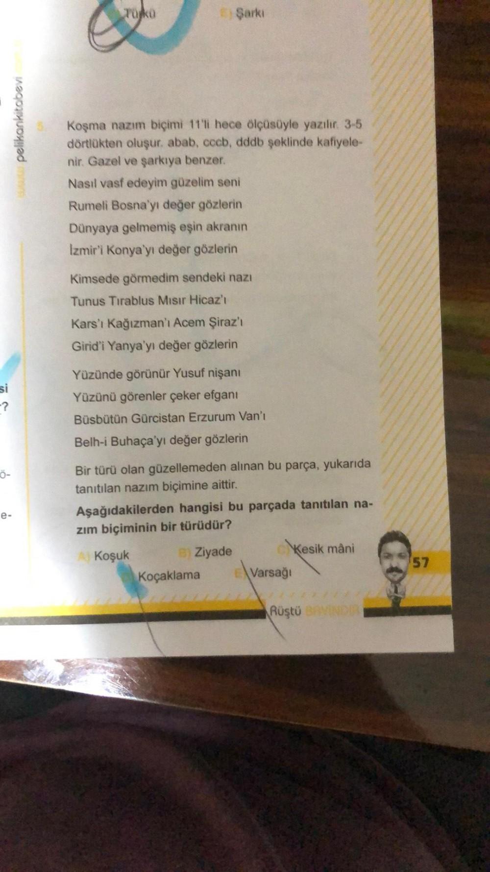 Tujko Şarki pelikankitaben Koşma nazım biçimi 11'li hece ölçüsüyle yazile 3-5 dörtlükten oluşur. abab, cccb, dddb şeklinde kafiyele- nir. Gazel ve şarkıya benzer. Nasıl vasf edeyim güzelim seni Rumeli Bosna'yı değer gözlerin Dünyaya gelmemiş eşin akranın Izmir'i Konya'yı değer gözlerin Kimsede görmedim sendeki nazi Tunus Tirablus Misir Hicaz'ı Kars'ı Kağızman'ı Acem Şiraz'ı Girid'i Yanya'yı değer gözlerin si Yüzünde görünür Yusuf nişanı Yüzünü görenler çeker efganı Büsbütün Gürcistan Erzurum Van'ı Belh-i Buhaça'yı değer gözlerin Ö- Bir türü olan güzellemeden alınan bu parça, yukarıda tanıtılan nazım biçimine aittir. Aşağıdakilerden hangisi bu parçada tanıtılan na- zim biçiminin bir türüdür? Koşuk Ziyade Kesik mâni Koçaklama Varsağı 57 Rüştü AND