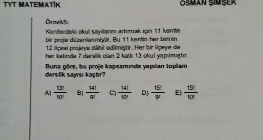 TYT MATEMATIK Örnek: Kentlerdeki okul sayılarını artırmak için 11 kentte bir proje düzenlenmiştir. Bu 11 kentin her birinin 12 ilçesi projeye dâhil edilmiştir. Her bir ilçeye de her katında 7 derslik olan 2 katlı 13 okul yapılmıştır. Buna göre, bu proje kapsamında yapılan toplam derslik sayısı kaçtır? A) 1 B) 19 10! 10! OSMAN ŞIMŞEK D) 151 E) 15! 10!