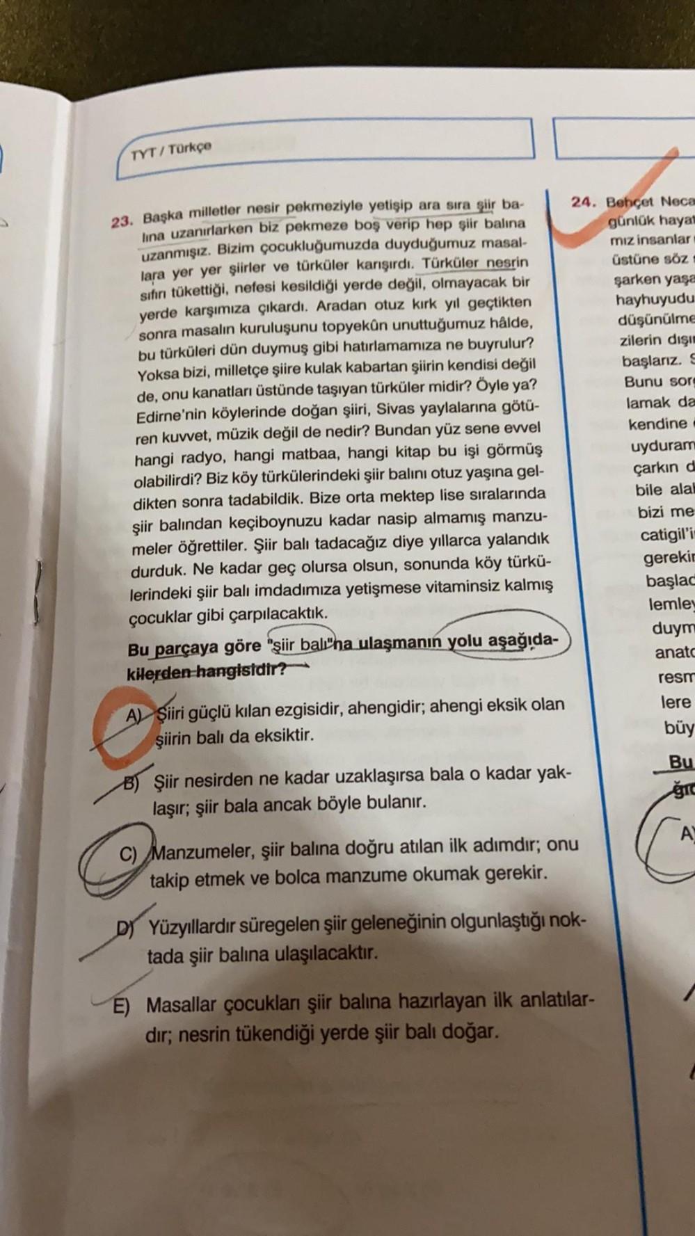 TYT/ Türkçe 23. Başka milletler nesir pekmeziyle yetişip ara sıra şiir ba- lina uzanırlarken biz pekmeze boş verip hep şiir balina uzanmışız. Bizim çocukluğumuzda duyduğumuz masal- lara yer yer şiirler ve türküler karışırdı. Türküler nesrin sıfırı tükettiği, nefesi kesildiği yerde değil, olmayacak bir yerde karşımıza çıkardı. Aradan otuz kırk yıl geçtikten sonra masalın kuruluşunu topyekûn unuttuğumuz hâlde, bu türküleri dün duymuş gibi hatırlamamıza ne buyrulur? Yoksa bizi, milletçe şiire kulak kabartan şiirin kendisi değil de, onu kanatları üstünde taşıyan türküler midir? Öyle ya? Edirne'nin köylerinde doğan şiiri, Sivas yaylalarına götü- ren kuvvet, müzik değil de nedir? Bundan yüz sene evvel hangi radyo, hangi matbaa, hangi kitap bu işi görmüş olabilirdi? Biz köy türkülerindeki şiir balını otuz yaşına gel- dikten sonra tadabildik. Bize orta mektep lise sıralarında şiir balından keçiboynuzu kadar nasip almamış manzu- meler öğrettiler. Şiir bali tadacağız diye yıllarca yalandık durduk. Ne kadar geç olursa olsun, sonunda köy türkü- lerindeki şiir balı imdadımıza yetişmese vitaminsiz kalmış çocuklar gibi çarpılacaktık. Bu parçaya göre "şiir balı"na ulaşmanın yolu aşağıda- kilerden hangisidir? 24. Behçet Neca günlük hayal miz insanlar üstüne söz şarken yasa hayhuyudu düşünülme zilerin dişi başlarız. Bunu sord lamak da kendine uyduram çarkın d bile alal bizi me catigil'i gerekir başlad lemley duym anatc resm A) Şiiri güçlü kılan ezgisidir, ahengidir; ahengi eksik olan şiirin balı da eksiktir. lere büy B) Şiir nesirden ne kadar uzaklaşırsa bala o kadar yak- laşır; şiir bala ancak böyle bulanır. Bu ğrc A C) Manzumeler, şiir balina doğru atılan ilk adımdır, onu takip etmek ve bolca manzume okumak gerekir. D) Yüzyıllardır süregelen şiir geleneğinin olgunlaştığı nok- tada şiir balina ulaşılacaktır. E) Masallar çocukları şiir balina hazırlayan ilk anlatılar- dir; nesrin tükendiği yerde şiir balı doğar.
