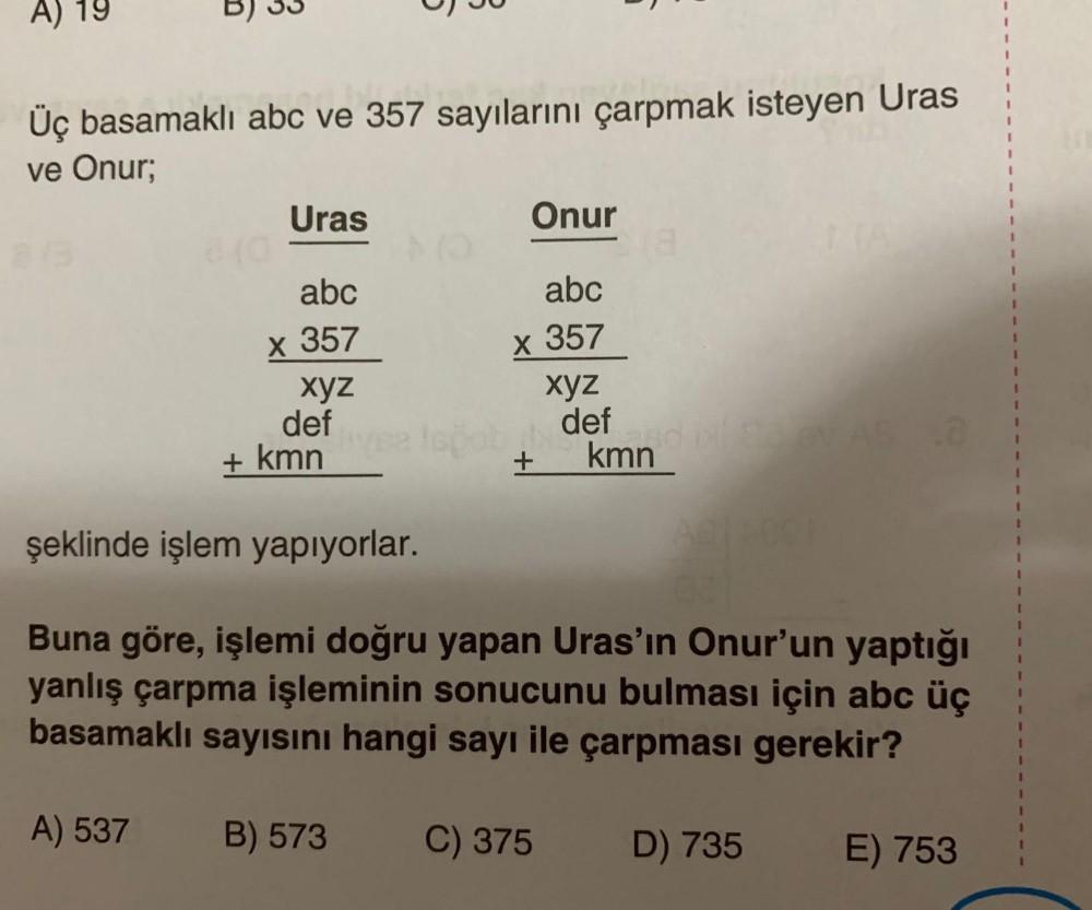 Üç basamaklı abc ve 357 sayılarını çarpmak isteyen Uras ve Onur; Uras abc x 357 xyz def + kmn Onur abc x 357 xyz fivee ispobjb defd bi ga ev AS la + kmn şeklinde işlem yapıyorlar. Buna göre, işlemi doğru yapan Uras'ın Onur'un yaptığı yanlış çarpma işleminin sonucunu bulması için abc üç basamaklı sayısını hangi sayı ile çarpması gerekir? A) 537 B) 573 C) 375 D) 735 E) 753