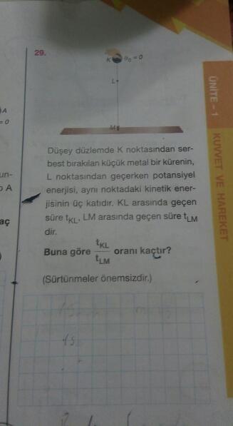 ÜNİTE - 1 KUVVET VE HAREKET un- Düşey düzlemde k noktasından ser- best bırakılan küçük metal bir kürenin, L noktasından geçerken potansiyel enerjisi, aynı noktadaki kinetik ener- jisinin üç katıdır. KL arasında geçen süre KL, LM arasında geçen süre tum dir. Buna göre oranı kaçtır? DA tum (Sürtünmeler önemsizdir.)