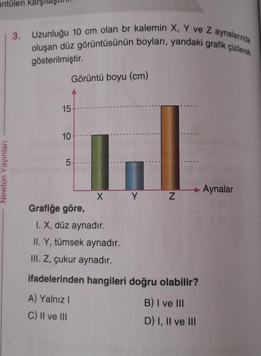 üntüleri karşıla Newton Yayınları 3. Uzunluğu 10 cm olan br kalemin X, Y ve Z aynalarında oluşan düz görüntüsünün boyları, yandaki grafik çizilerek gösterilmiştir. Görüntü boyu (cm) 15- 10- 5 X Grafiğe göre, I. X, düz aynadır. II. Y, tümsek aynadır. III. Z, çukur aynadır. Y Z →→ Aynalar ifadelerinden hangileri doğru olabilir? A) Yalnız I B) I ve III C) II ve III D) I, II ve III
