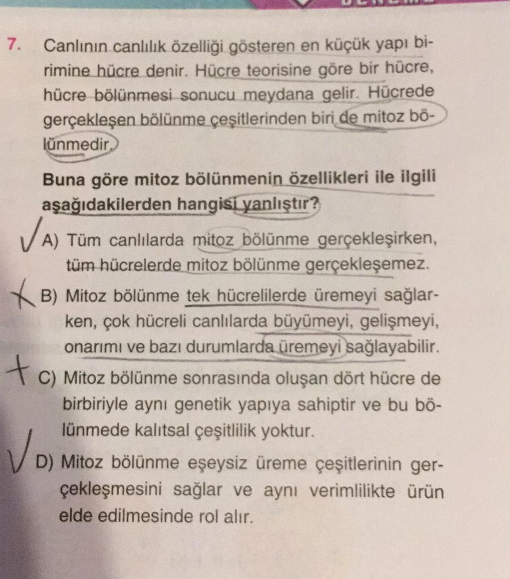 VA 7. Canlının canlılık özelliği gösteren en küçük yapı bi- rimine hücre denir. Hücre teorisine göre bir hücre, hücre bölünmesi sonucu meydana gelir. Hücrede gerçekleşen bölünme çeşitlerinden biri de mitoz bö- lünmedir Buna göre mitoz bölünmenin özellikleri ile ilgili aşağıdakilerden hangisi yanlıştır? A) Tüm canlılarda mitoz bölünme gerçekleşirken, tüm hücrelerde mitoz bölünme gerçekleşemez. B) Mitoz bölünme tek hücrelilerde üremeyi sağlar- ken, çok hücreli canlılarda büyümeyi, gelişmeyi, onarımı ve bazı durumlarda üremeyi sağlayabilir. t C) Mitoz bölünme sonrasında oluşan dört hücre de birbiriyle aynı genetik yapıya sahiptir ve bu bö- lünmede kalitsal çeşitlilik yoktur. D) Mitoz bölünme eşeysiz üreme çeşitlerinin ger- çekleşmesini sağlar ve aynı verimlilikte ürün elde edilmesinde rol alır. Vo