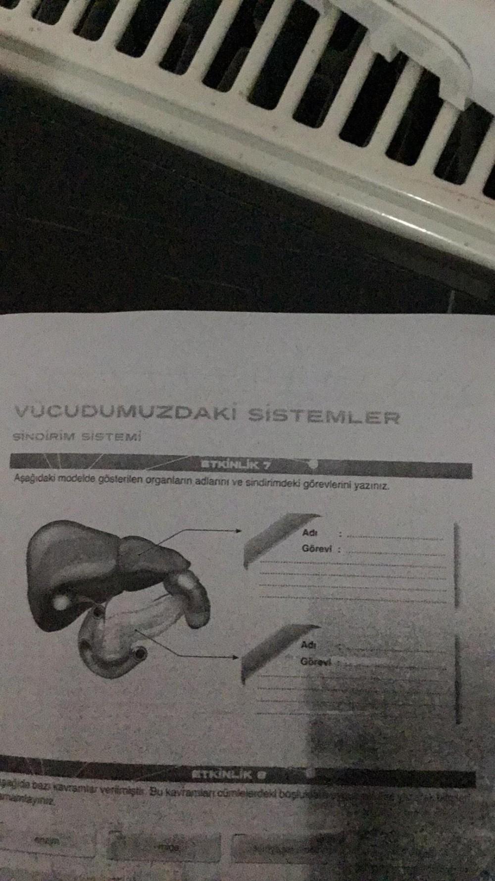 VUCUDUMUZDAKI SISTEMLER SİNDİRİM SİSTEMİ AZER ETKİNLİK 7 Aşağıdaki modelde gösterilen organların adlarını ve sindirimdeki görevlerini yazınız. Adi Görevi : Ad Görevi ETKİNLİK @ pa da bazı kavramlar vermiştir. Bu kavramian cümlelerdeki boşlukale