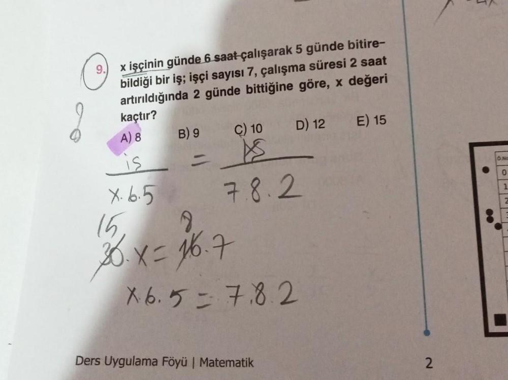 x işçinin günde 6 saat-çalışarak 5 günde bitire- bildiği bir iş; işçi sayısı 7, çalışma süresi 2 saat artırıldığında 2 günde bittiğine göre, x değeri kaçtır? A) 8 is B) 9 = C) 10 X. 6.5 15. 36.x = 16.7 7.8.2 X. 6.5 = 7.8.2 D) 12 E) 15 Ders Uygulama Föyü | Matematik 2 ONO 0 1