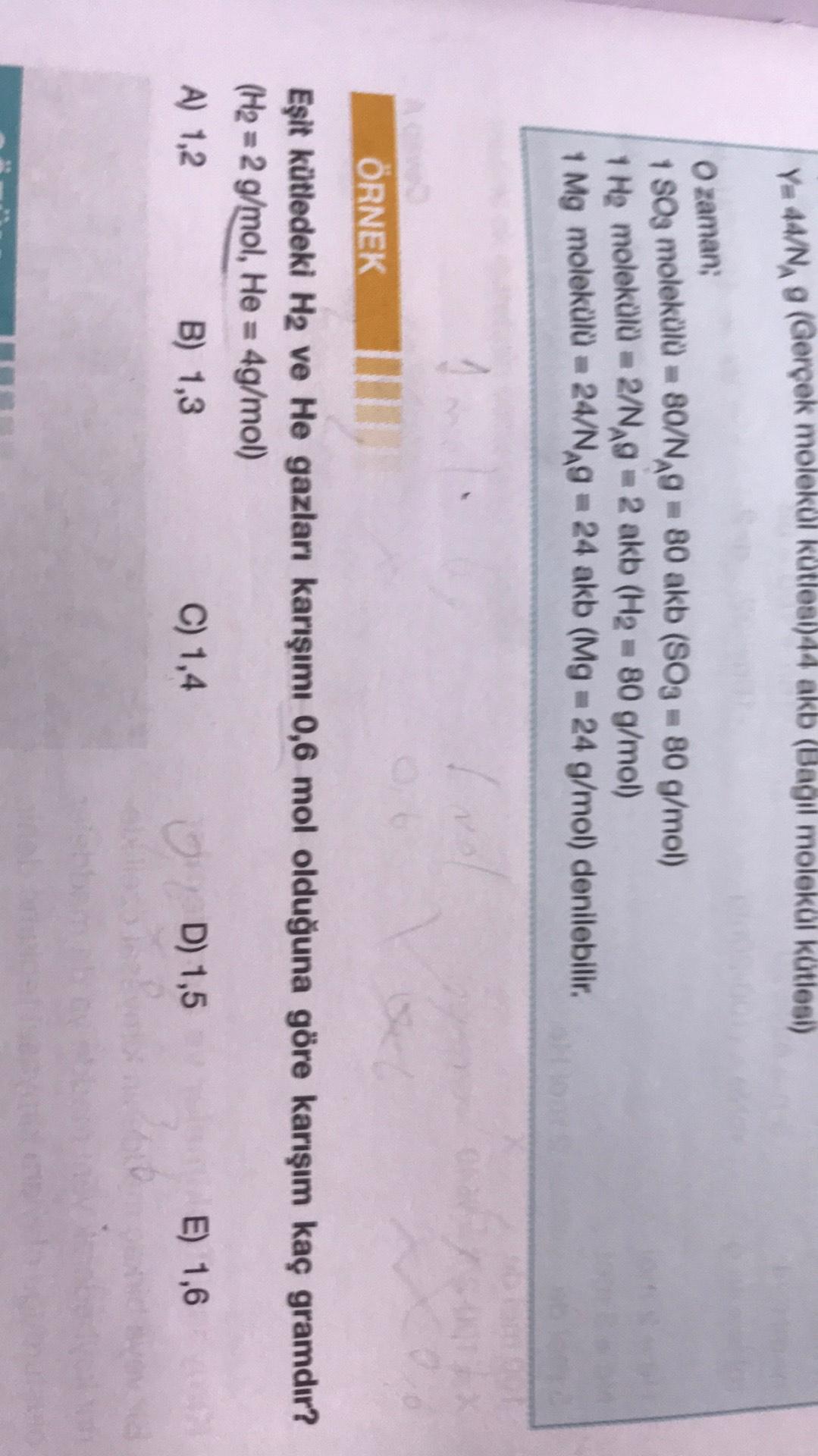 Ya 44/N, 9 (Gerçek molekul kütlesi)44 akb (Bagil molekul kotlesi ) O zaman; 1 Sog molekulu = 80/N 9 = 80 akb (SO3 = 80 g/mol) S03 1 HQ molekülü = 2/Nag - 2 akb (H2 = 80 g/mol) Hg * Mg molekul = 24/N 9 = 24 akb (Mg = 24 g/mol) denilebilir. NA9 ÖRNEK Eşit kütledeki H2 ve He gazları karışımı 0,6 mol olduğuna göre karışım kaç gramdır? (H2 = 2 g/mol, He = 4g/mol) A) 1,2 B) 1,3 C) 1,4 D) 1,5 E) 1,6