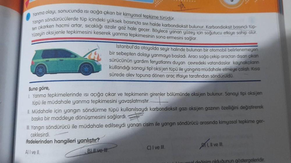 Yanma olayı, sonucunda ısı açığa çıkan bir kimyasal tepkime türüdür. Yangın söndürücülerde tüp içindeki yüksek basınçta sıvı halde karbondioksit bulunur. Karbondioksit basınçlı tüp- ten çıkarken hacmi artar, sıcaklığı azalır gaz hale geçer. Böylece yanan yüzey için soğutucu etkiye sahip olur. Yüzeyin oksijenle tepkimesini keserek yanma tepkimesinin sona ermesini sağlar. İstanbul'da otoyolda seyir halinde bulunan bir otomobil belirlenemeyen bir sebepten dolayı yanmaya başladı. Aracı sağa çekip araçtan dışarı çıkan sürücünün yardım feryatlarını duyan çevredeki vatandaşlar kaynakçıların kullandığı sanayi tipi oksijen tüpü ile yangına müdahale etmeye çalıştı. Kısa sürede alev topuna dönen araç itfaiye tarafından söndürüldü. Buna göre, L Yanma tepkimelerinde ısı açığa çıkar ve tepkimenin girenler bölümünde oksijen bulunur. Sanayi tipi oksijen tüpü ile müdahale yanma tepkimesini yavaşlatmıştır.. IL Müdahale için yangın söndürme tüpü kullanılsaydı karbondioksit gazı oksijen gazının özelliğini değiştirerek başka bir maddeye dönüşmesini sağlardı. III. Yangın söndürücü ile müdahale edilseydi yanan cisim ile yangın söndürücü arasında kimyasal tepkime ger- çekleşirdi. ifadelerinden hangileri yanlıştır? A) I ve II. BLIL ve C) I ve III. 11. ve olduğunun göstergeleridir.