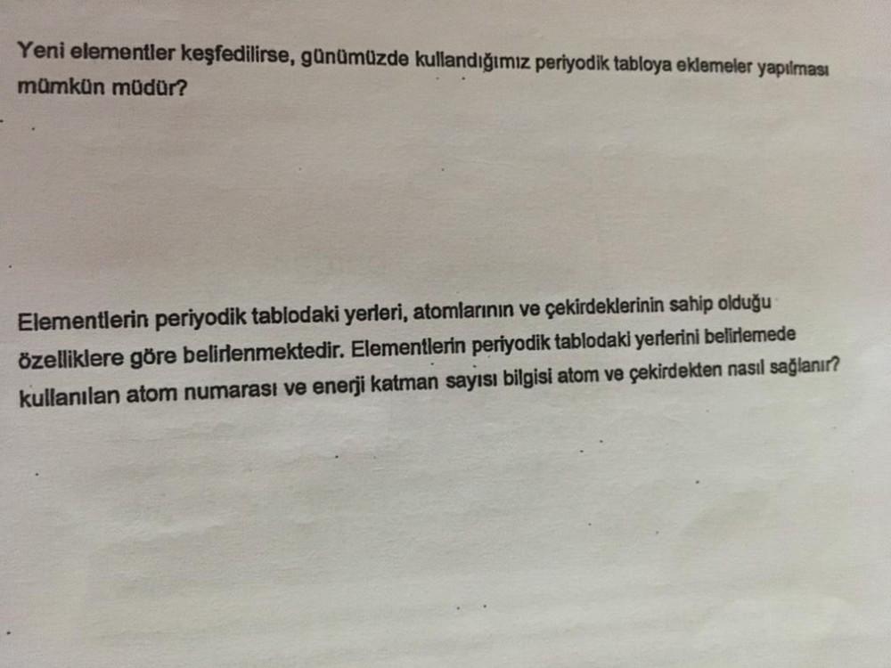 Yeni elementler keşfedilirse, günümüzde kullandığımız periyodik tabloya eklemeler yapılması mümkün müdür? Elementlerin periyodik tablodaki yerleri, atomlarının ve çekirdeklerinin sahip olduğu özelliklere göre belirlenmektedir. Elementlerin periyodik tablodaki yerlerini belirlemede kullanılan atom numarası ve enerji katman sayısı bilgisi atom ve çekirdekten nasıl sağlanır?