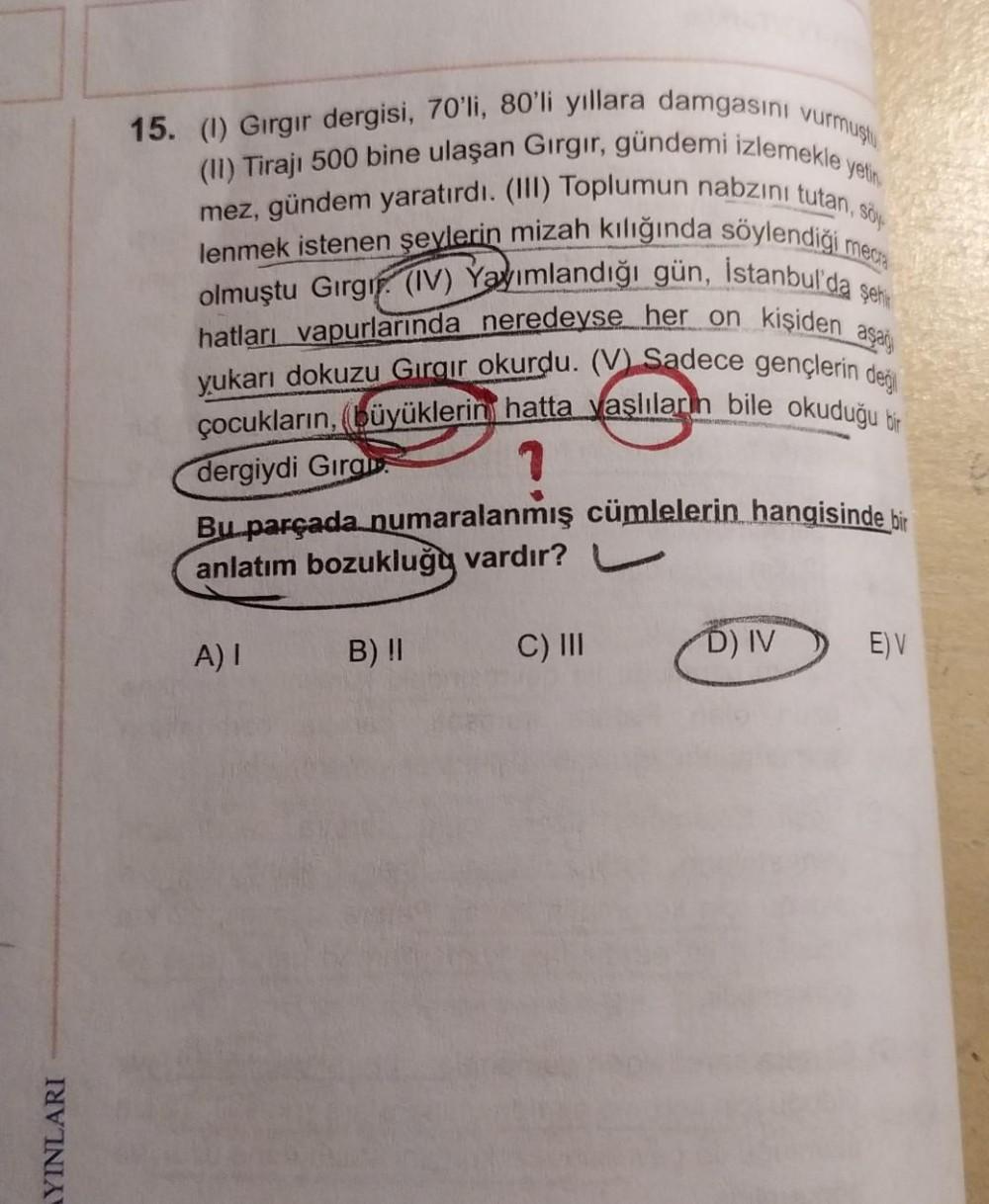 yetin 15. (1) Girgir dergisi, 70'li, 80'li yıllara damgasını vurmuştu mez, gündem yaratırdı. (III) Toplumun nabzını tutan, soy (11) Tirajı 500 bine ulaşan Girgir, gündemi izlemekle y lenmek istenen şeylerin mizah kılığında söylendigi media hatları vapurlarında neredeyse her on kişiden aşağı olmuştu Gırgır. (IV) Yayımlandığı gün, İstanbul'da şehir yukarı dokuzu Gırgır okurdu. (V) Sadece gençlerin deği çocukların, büyüklerin hatta yaşlıların bile okuduğu bir 2 Bu parçada numaralanmış cümlelerin hangisinde bir anlatım bozukluğı vardır? dergiydi Girai. B)! A) C) III D) IV E) V YINLARI