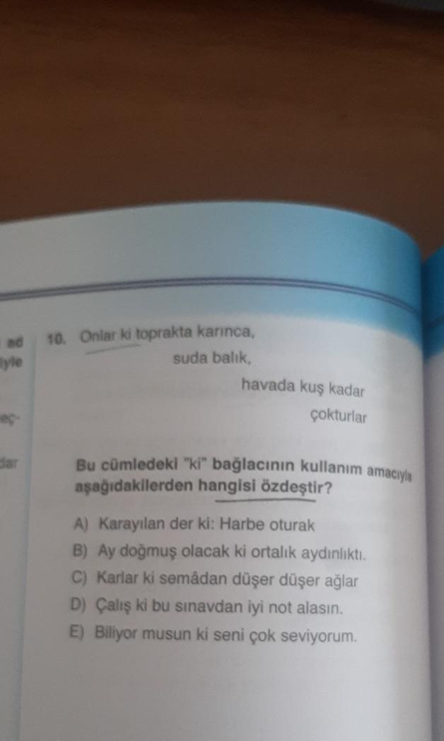 yle dar 10. Onlar ki toprakta karınca, suda balık, havada kuş kadar çokturlar Bu cümledeki "ki" bağlacının kullanım amacıyla aşağıdakilerden hangisi özdeştir? A) Karayılan der ki: Harbe oturak B) Ay doğmuş olacak ki ortalık aydınlıktı. C) Karlar ki semâdan düşer düşer ağlar D) Çalış ki bu sınavdan iyi not alasın. E) Biliyor musun ki seni çok seviyorum.